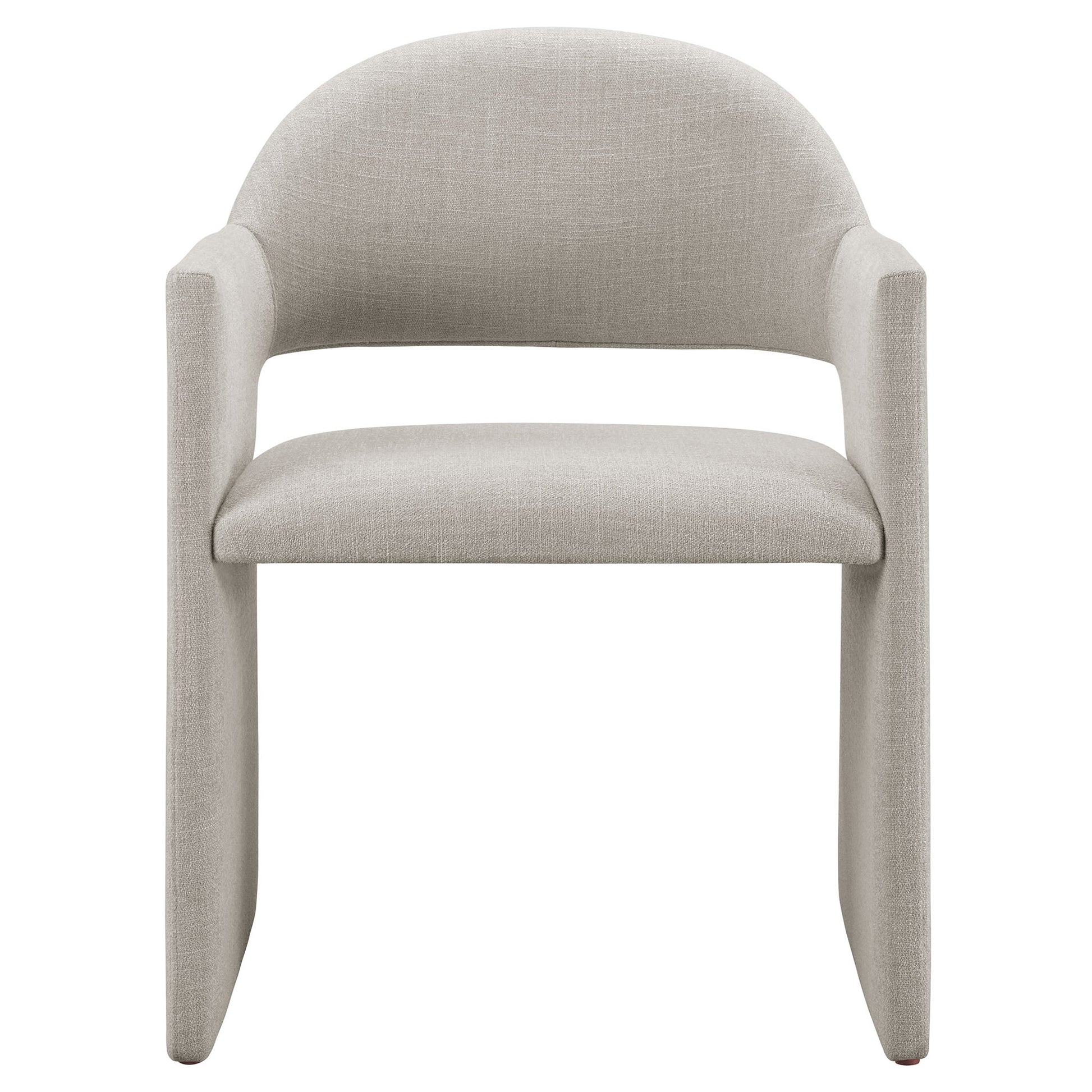 Use:The Talia Upholstered Dining Chair is a stunning example of modern design, blending clean lines with luxurious comfort. Whether as a stylish living room accent chair, a statement piece in the dining area, or even a chic office accent chair, the Talia Barrel Back Dining Chair offers both timeless style and versatility. Built on a sturdy bentwood frame, this dining chair with arms is fully upholstered in soft slub weave fabric for a premium feel. Its elegantly curved backrest flows seamlessly into angular armrests that extend down to the floor, creating a sculptural look that's perfect for minimalist and contemporary spaces. The open-back design of this curved dining chair provides a light and airy feel, while the generously padded seat ensures lasting comfort. Completing the design, floor-protecting foot pins are included to prevent scratches, making it easy to move and enjoy without worry. The Talia Dining Armchair arrives fully assembled, ready to elevate your space. Weight Capacity: 300 lbs.