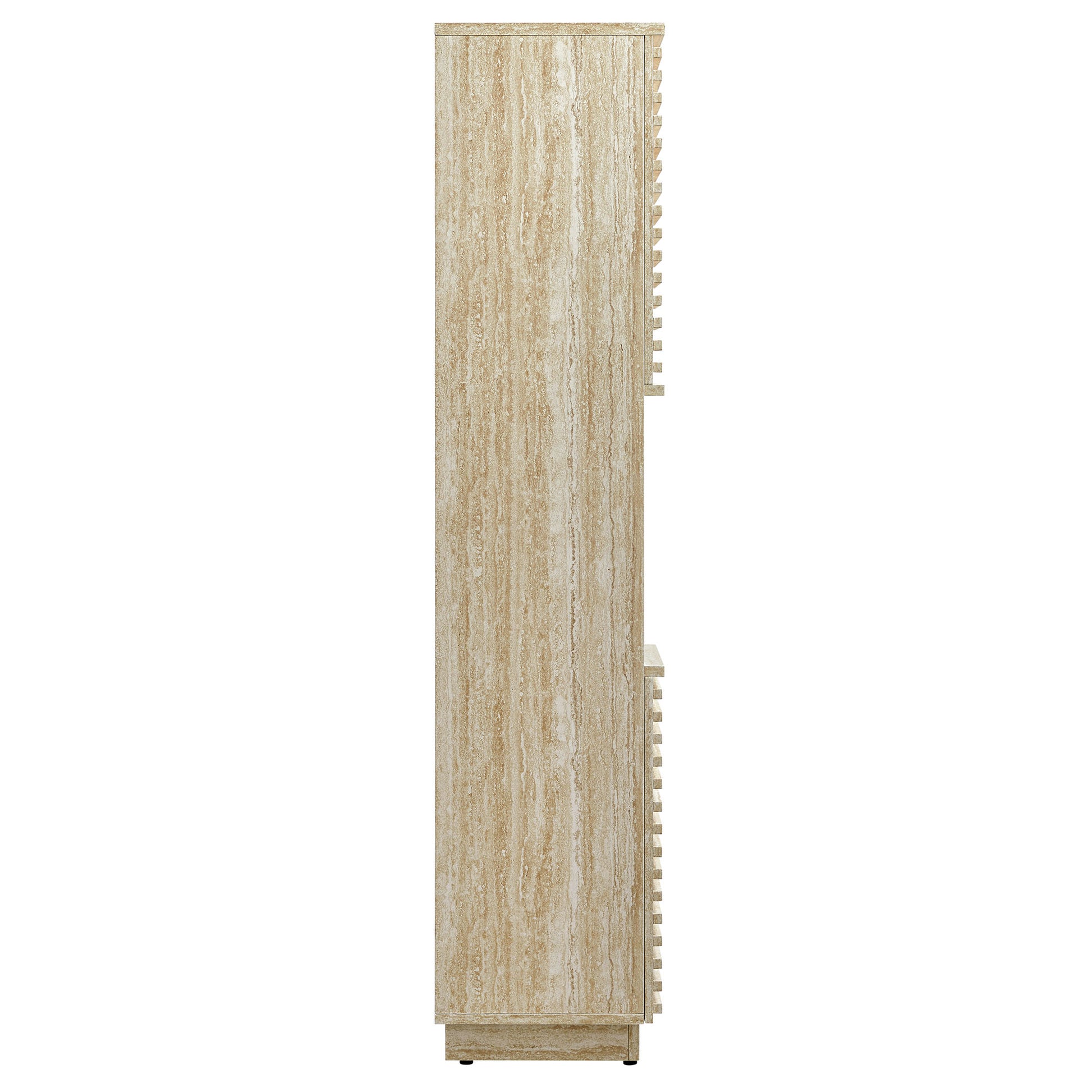 Use:Tap into mid-century aesthetics with the Render Bathroom Storage Cabinet. This 63-inch tall storage cabinet boasts two open shelves and two concealed storage areas behind soft-close hinged doors. Each door on the bathroom tower displays beautifully designed slatted details, creating sleek lines and a crisp look designed to bring modernity to any room in your home, from the powder room to the living room to your kitchen or dining space. These doors open to reveal adjustable shelves within, offering a tailored storage solution. Matching the doors' modern aesthetic, the rest of the tall narrow cabinet is just as thoughtfully designed, featuring a durable particleboard frame with faux travertine laminate. Abounding in mid-century modern style, this tall bathroom storage cabinet with 2 doors offers a solid construction with a pleasing look and practical functionality perfect for storing towels, bathroom essentials, books, home decor, dinnerware, and more. This versatile linen cabinet includes non-marking glides to protect flooring. Assembly required.
