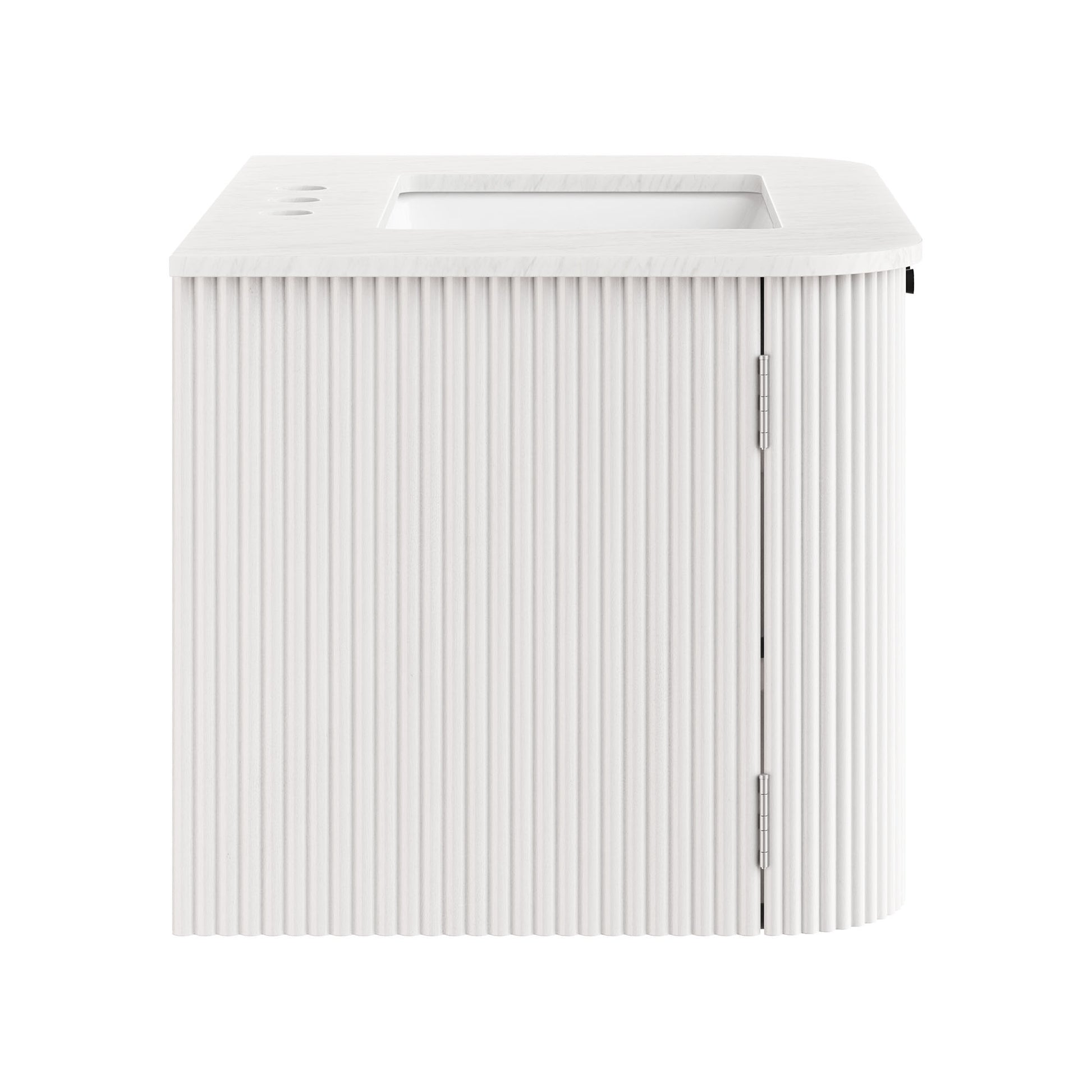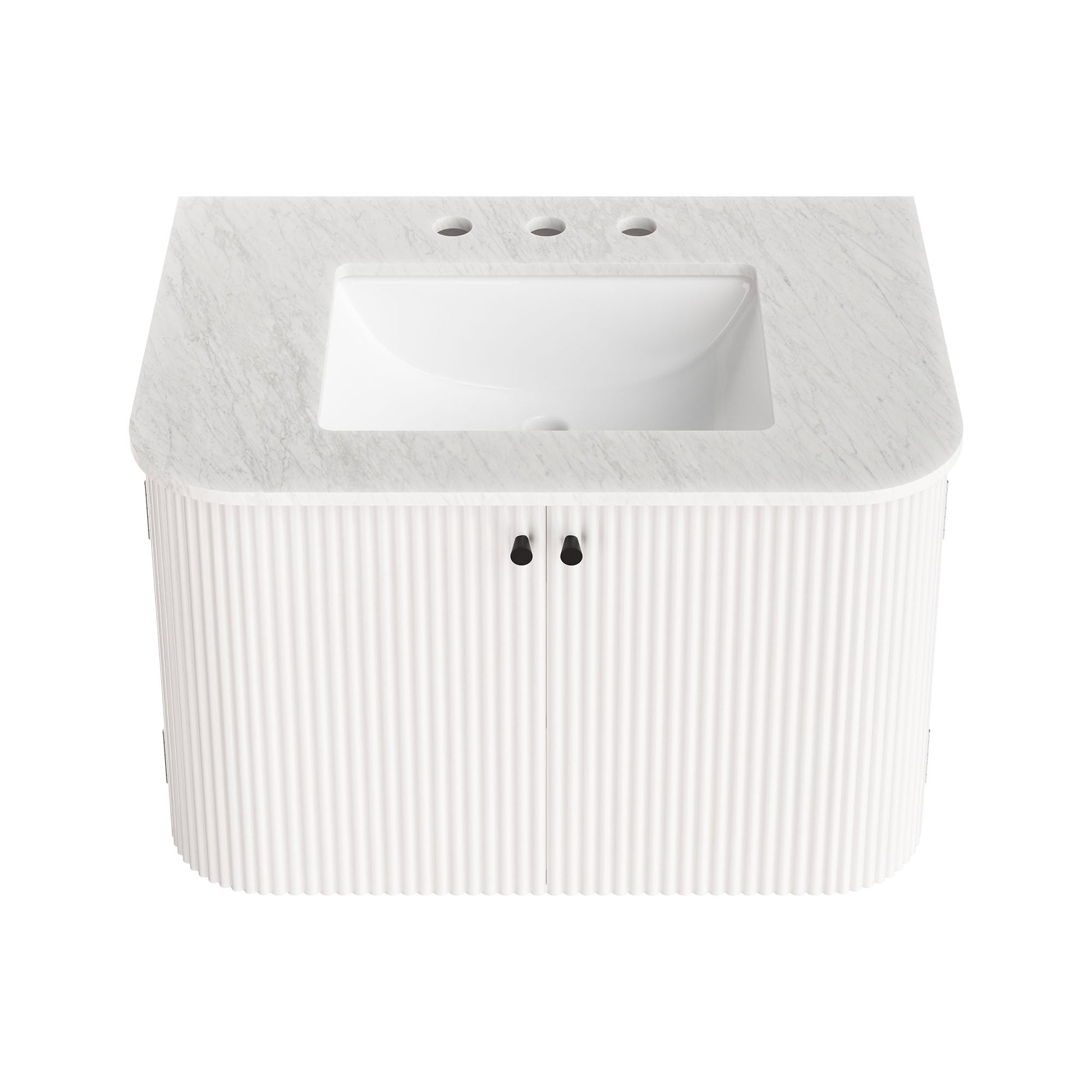 Use:Give your bathroom a modern upgrade with the Zia 30? Wall Mount Vanity. Its floating, wall-mounted design opens up the space, creating a light and airy feel. The solid wood base features a textured fluted pattern, with deep vertical grooves that add both visual interest and a touch of depth. The marble sink top, complete with a curved basin and three 8" widespread faucet holes, gives you plenty of options for a faucet that suits your style. Inside, two soft-close hinged doors reveal adjustable shelves for convenient storage, and cutouts for plumbing ensure a seamless installation. The Zia Modern Bathroom Vanity with Sink effortlessly blends modern design with everyday function, bringing timeless beauty and chic practicality to your bathroom. Assembly is required and fixtures are not included. Weight Capacity: 132 lbs.