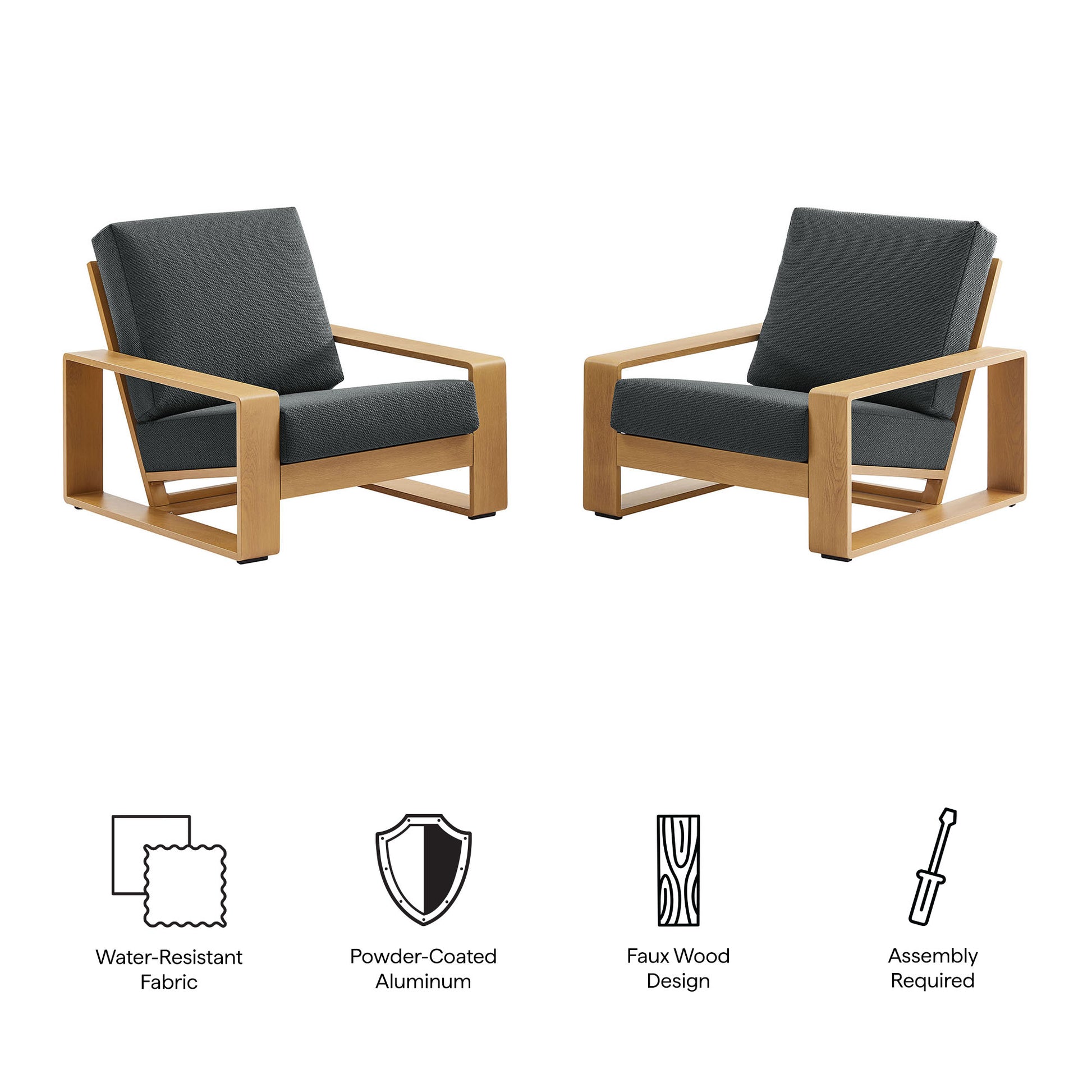Use:Unwind in sculptural sophistication with the Lirienne Outdoor Patio Armchair Set. Designed for modern relaxation, these two matching outdoor chairs showcase sleek, rectangular frames crafted from durable powder-coated aluminum with a faux wood pattern, offering both resilience and style. The deep, angled seats and plush foam cushions invite you to sink into comfort, while the subtle textured weave upholstery is stain-resistant, weather-resistant, and easy to maintain with removable, washable covers. Perfect for lounging on a sun-drenched deck, cozy balcony, or shaded patio, this set of two aluminum patio chairs brings an air of refined ease to any alfresco setting. Weight Capacity (each): 300 lbs.