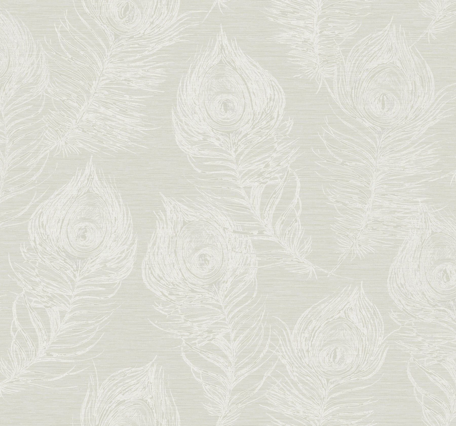 Use:Pearlescent white feathers from the train of the peafowl create a magnificent display against pale grey in pattern Regal Peacock. This Regal Peacock Wallpaper measures approximately 27 inches wide by 27 feet long, measuring approximately 60.8 square feet per roll. Organic simplicity and lustrous adornment for the modern home.