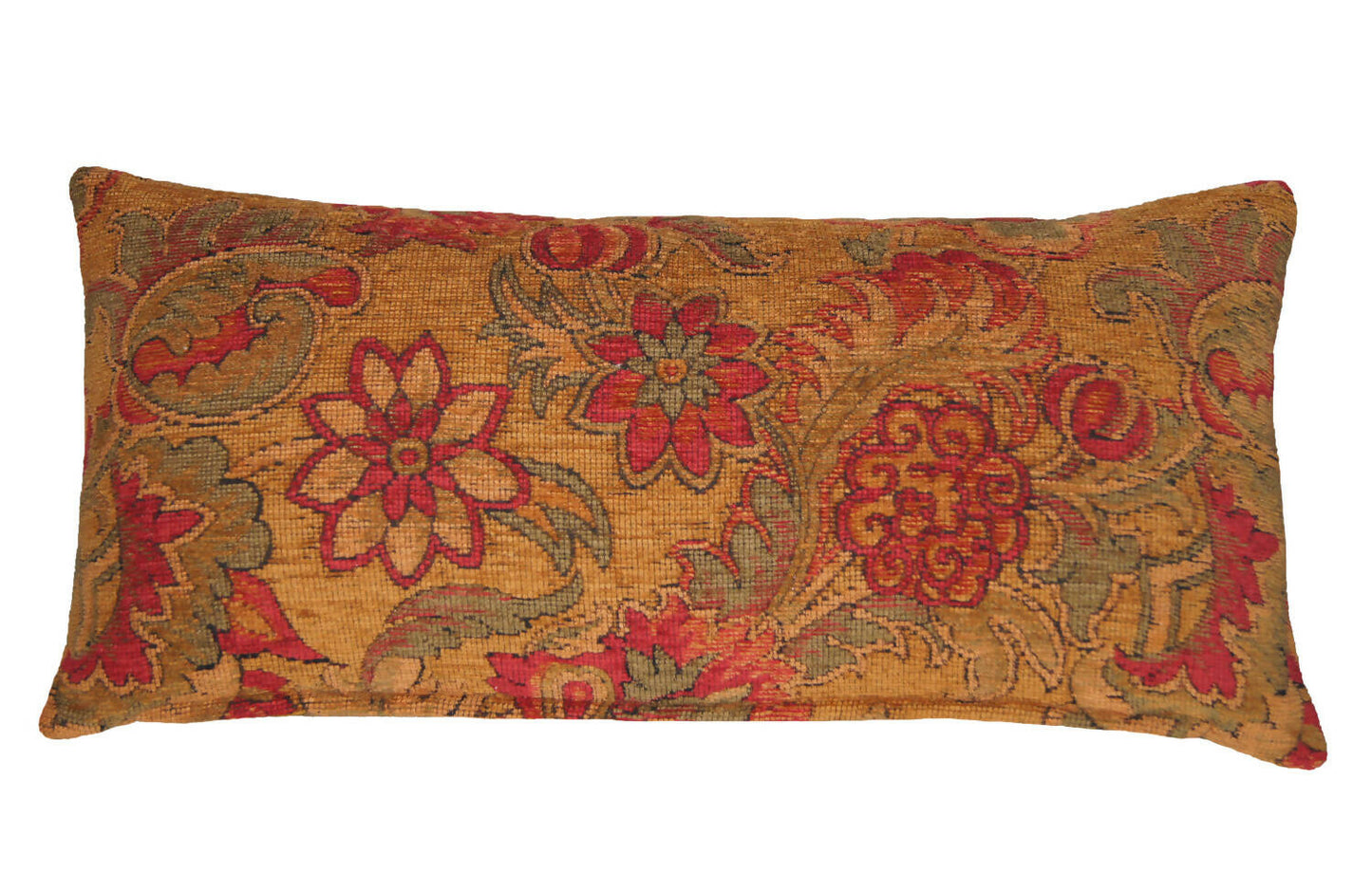 Red and sage flowers edged in black are woven into a rich, gold background in this charming chenille pillow cover. A soft sage green diagonal stripe back fabric, knife edge and zippered bottom finish this 18" x 9" accent pillow.