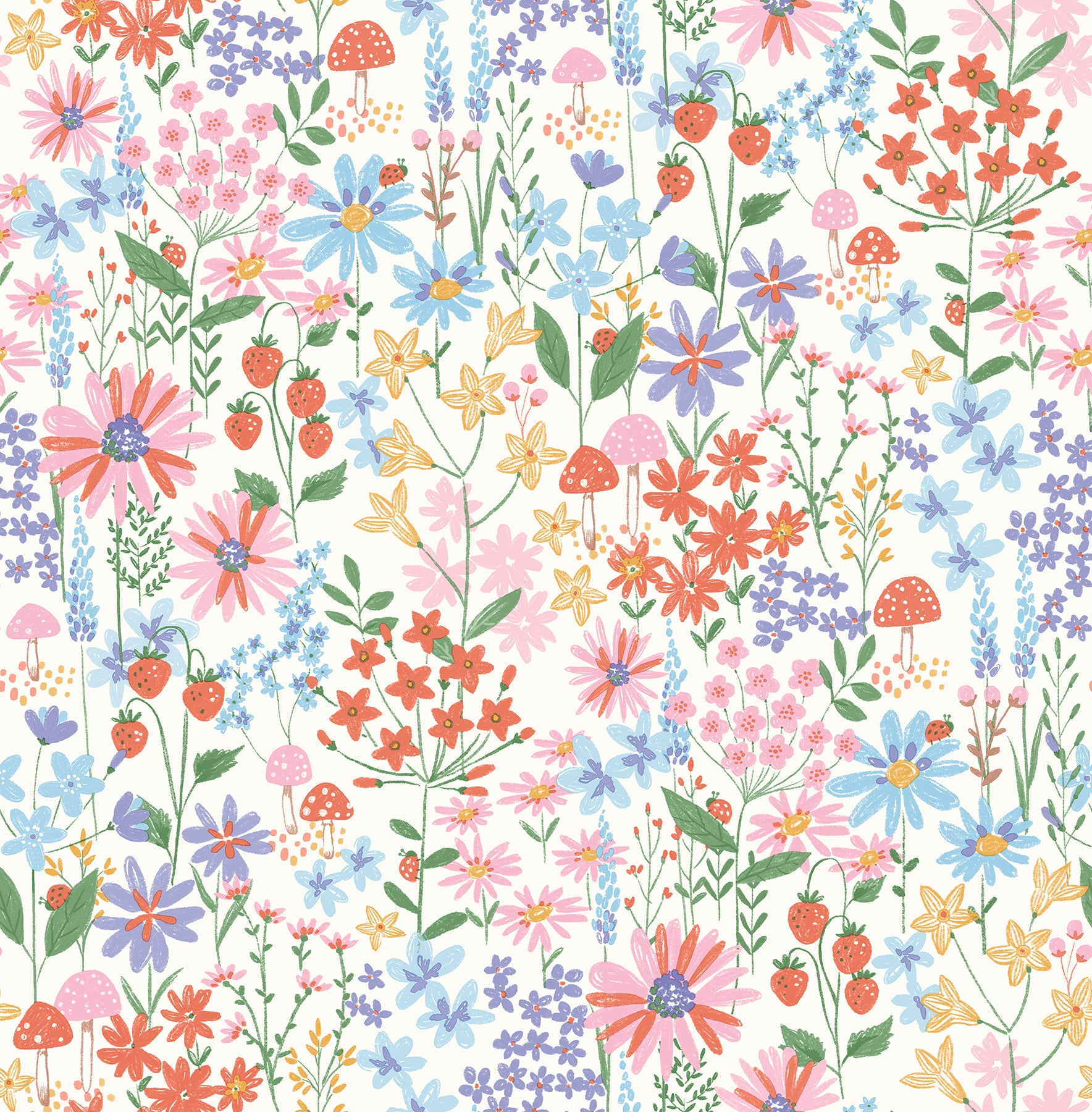 Use:The delight of a garden in full bloom is perfectly captured in this playful floral wallpaper. The design is filled to bursting with blossoms, berries, and ladybugs, all drawn in an energetic, illustrative style. Featured here in vibrant pastel hues including pink, red, purple, light blue, bright yellow, and green. Zena is an unpasted, paper wallpaper measuring 20.5 inches wide by 33 feet long, covering approximately 56.4 square feet per roll. Unpasted paper material; 20.9-in repeat, straight match; Washable and peelable; 20.5-in by 33-ft long roll; Covers about 56.4 square feet