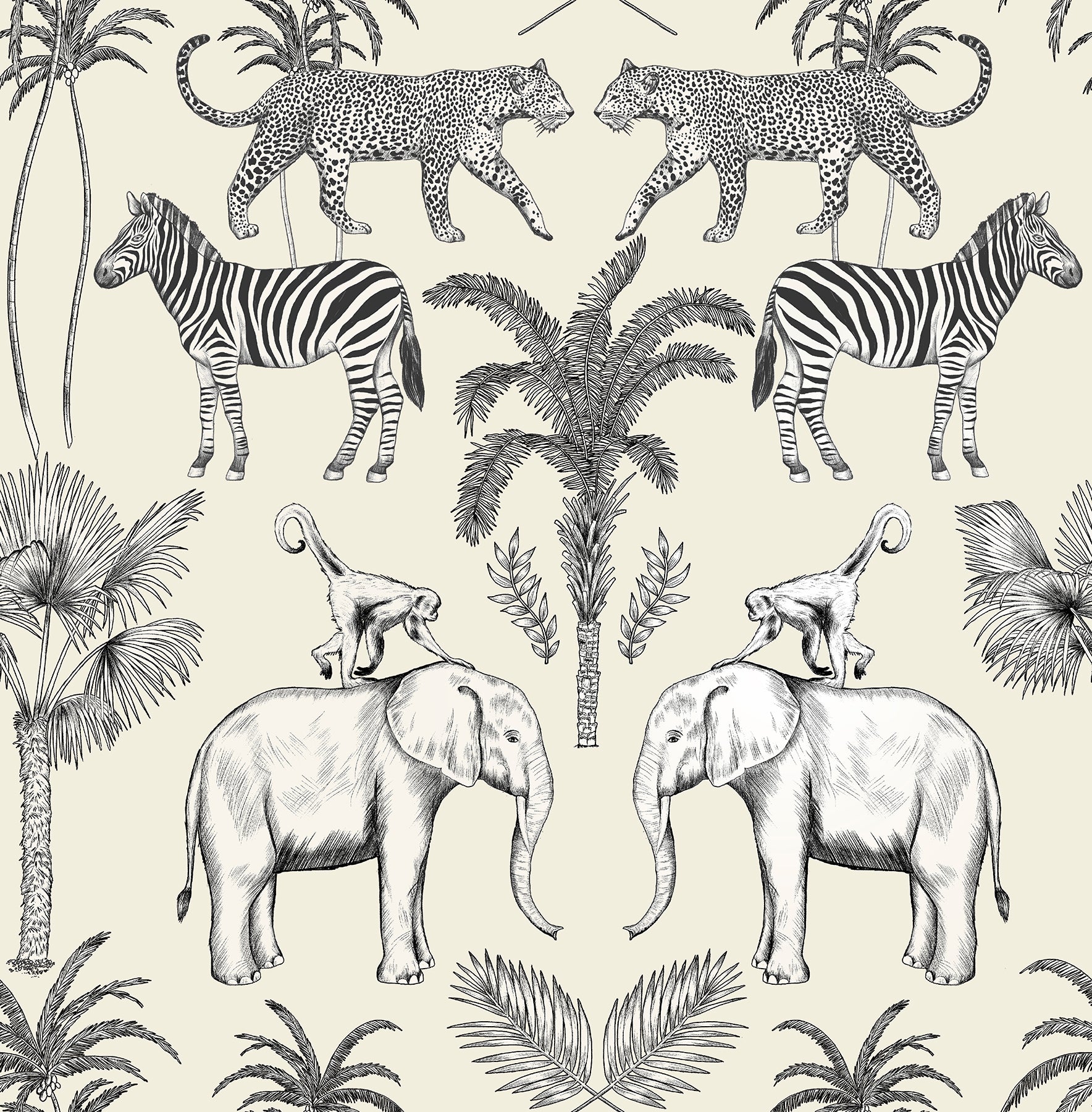 Use:The symmetrical showcasing of safari animals adds an orderly element to this wild promenade. The flora and fauna are inked in white and black along a cream backdrop. Nauman is an unpasted, paper wallpaper measuring 20.5 inches wide by 33 feet long, covering approximately 56.4 square feet per roll. Unpasted paper material; 20.9-in repeat, straight match; Washable and peelable; 20.5-in by 33-ft long roll; Covers about 56.4 square feet