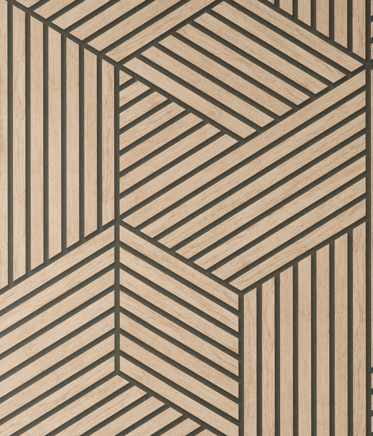Use:The appeal of wooden accent walls enjoys added complexity with this modern wallpaper. The thin, light brown wooden slats are arranged in a compelling, hexagonal pattern along a black backdrop. Gerrit is an unpasted, paper wallpaper measuring 20.5 inches wide by 33 feet long, covering approximately 56.4 square feet per roll. Unpasted paper material; 4.2-in repeat, drop match; Washable and peelable; 20.5-in by 33-ft long roll; Covers about 56.4 square feet