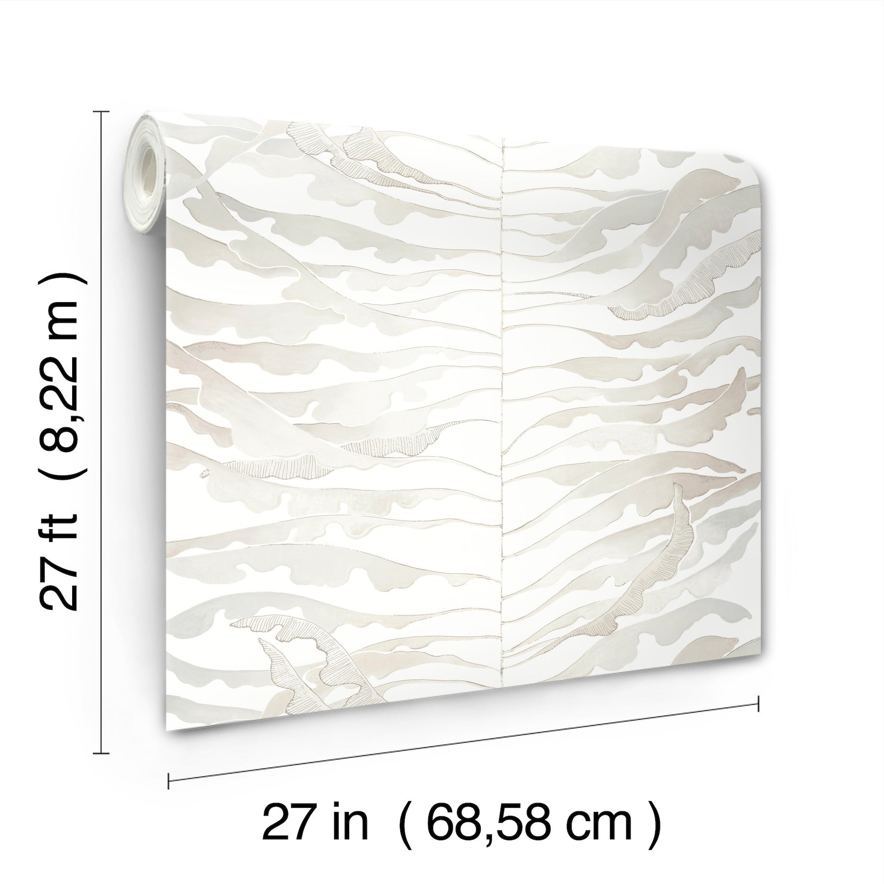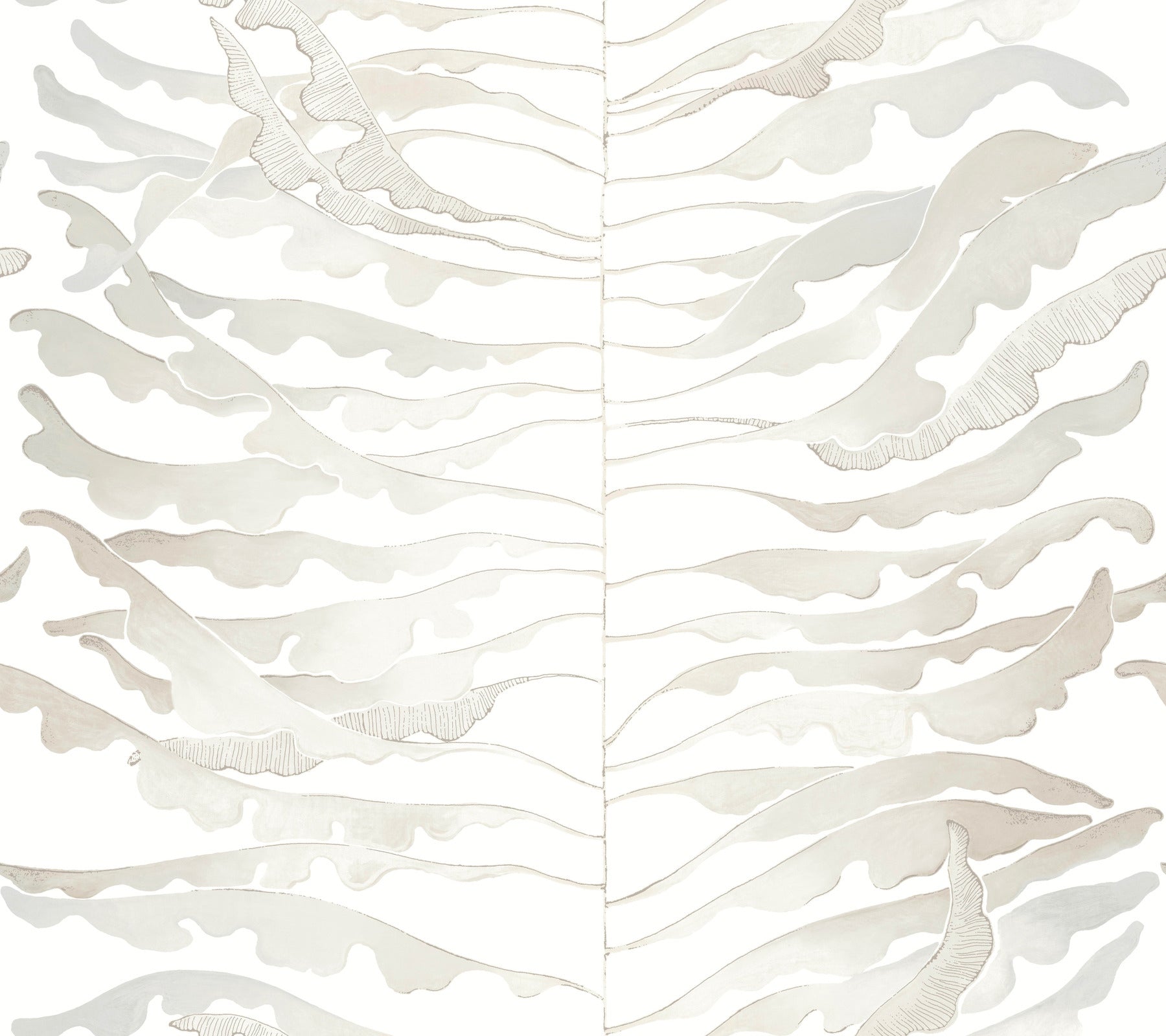 Use:An organic take on striped accents, Leaf Column's illustrative design features thin, curling fronds watercolored in shades of pale grey along a central connective stem embellished with silver highlights. This Leaf Column Wallpaper measures approximately 27 inches wide by 27 feet long, measuring approximately 60.8 square feet per roll. Textural, organic forms grounded in earthly inspiration.