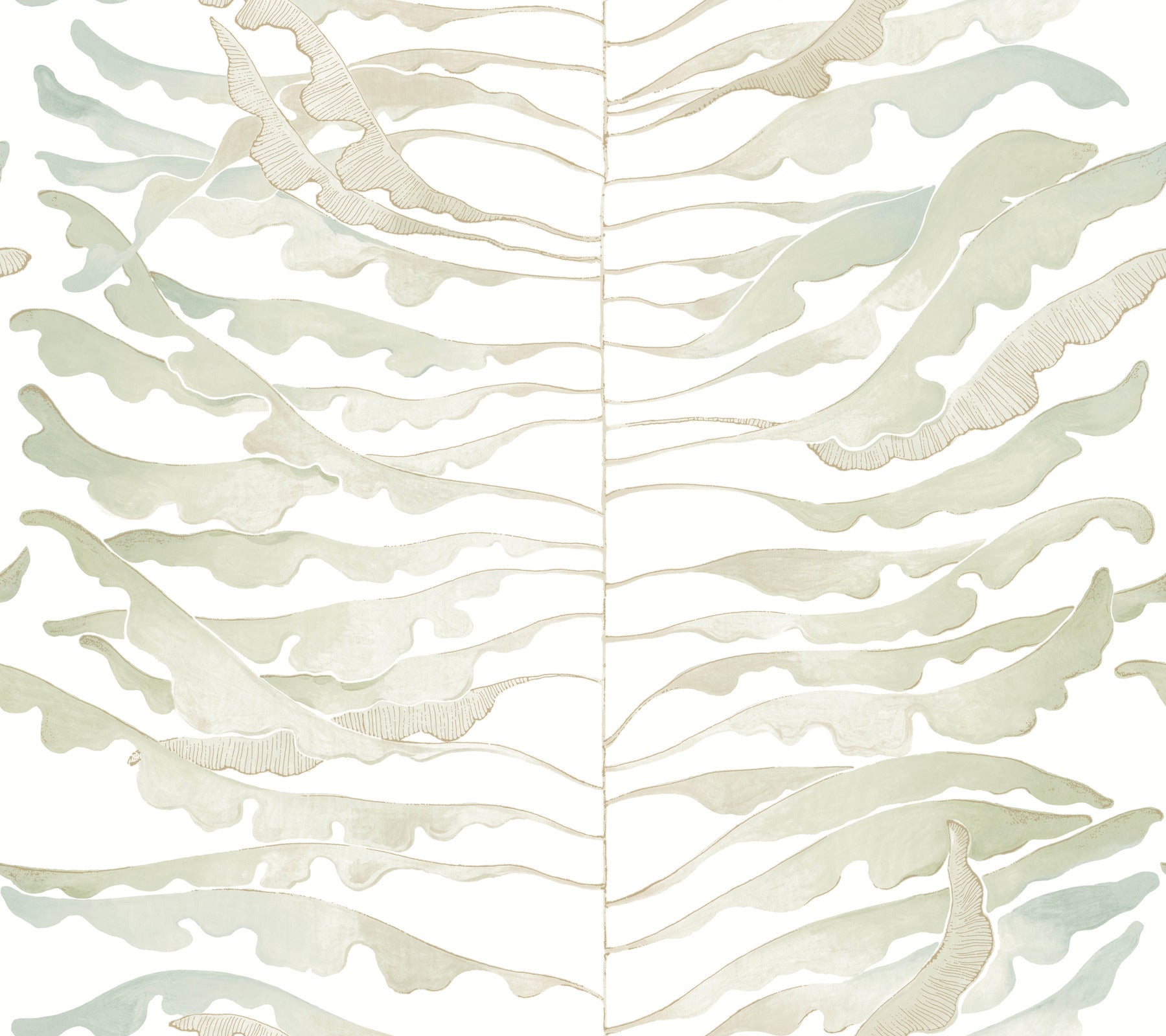 Use:An organic take on striped accents, Leaf Column's illustrative design features thin, curling fronds watercolored in shades of pale green, blue, and taupe along a central connective stem embellished with golden highlights. This Leaf Column Wallpaper measures approximately 27 inches wide by 27 feet long, measuring approximately 60.8 square feet per roll. Textural, organic forms grounded in earthly inspiration.