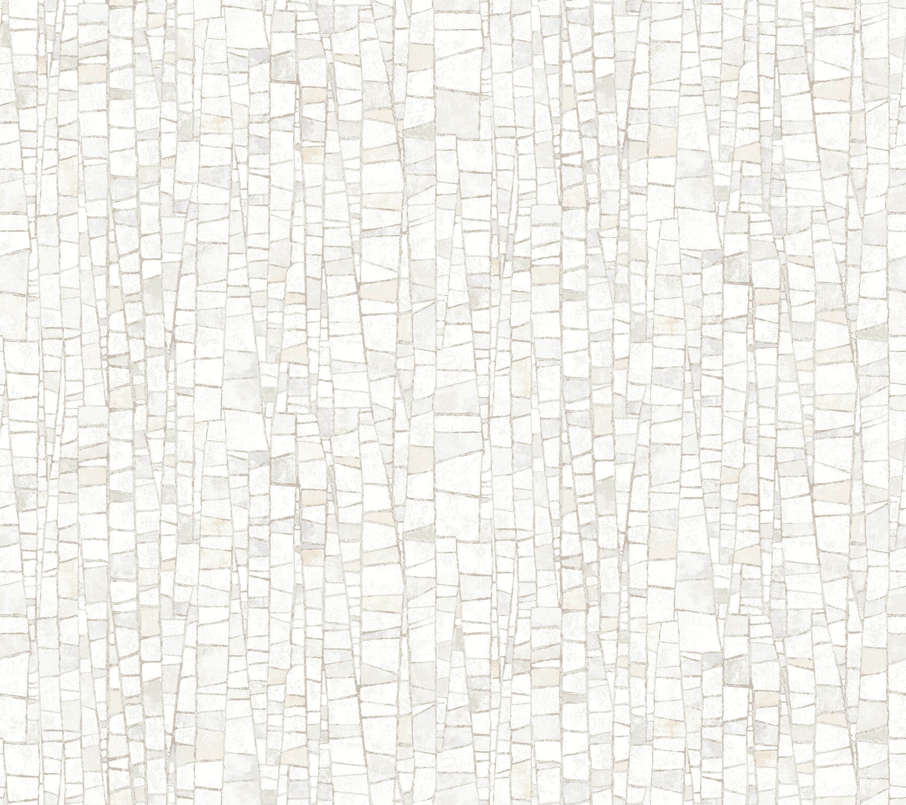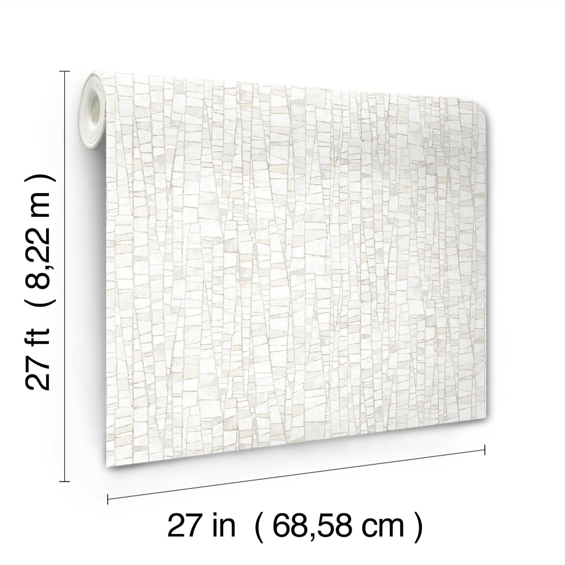 Use:The mosaic-like tiling of design Kaleidoscopic strikes the perfect balance of rustic and refined, featuring a variety of pale greys and cream accented by metallic silver highlights. This Kaleidoscopic Wallpaper measures approximately 27 inches wide by 27 feet long, measuring approximately 60.8 square feet per roll. Textural, organic forms grounded in earthly inspiration.
