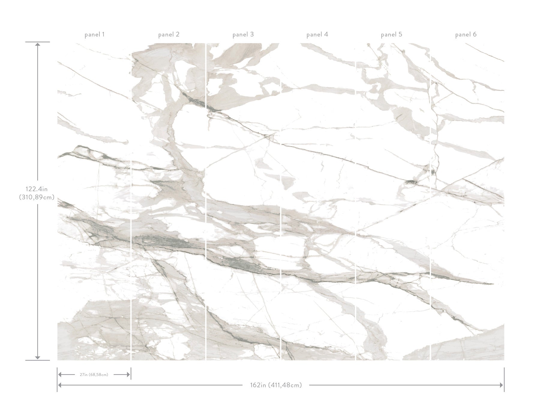 Use:The luxurious beauty of a large marble slab, featuring swirling veins of taupe and pale grey along white, is translated onto a wall mural for added versatility and convenience. This Imperial Marble Mural measures approximately 13.5-ft wide by 10.2-ft tall when assembled. Textural, organic forms grounded in earthly inspiration.