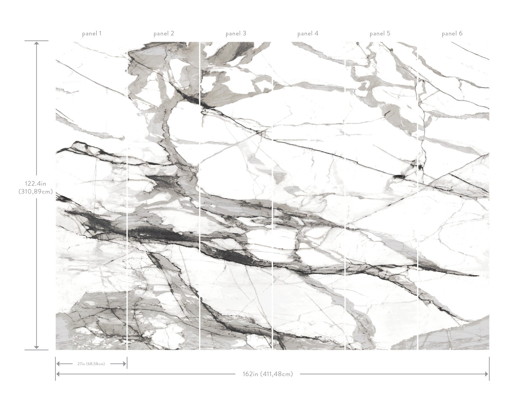 Use:The luxurious beauty of a large marble slab, featuring swirling veins of rich black and grey along white, is translated onto a wall mural for added versatility and convenience. This Imperial Marble Mural measures approximately 13.5-ft wide by 10.2-ft tall when assembled. Textural, organic forms grounded in earthly inspiration.