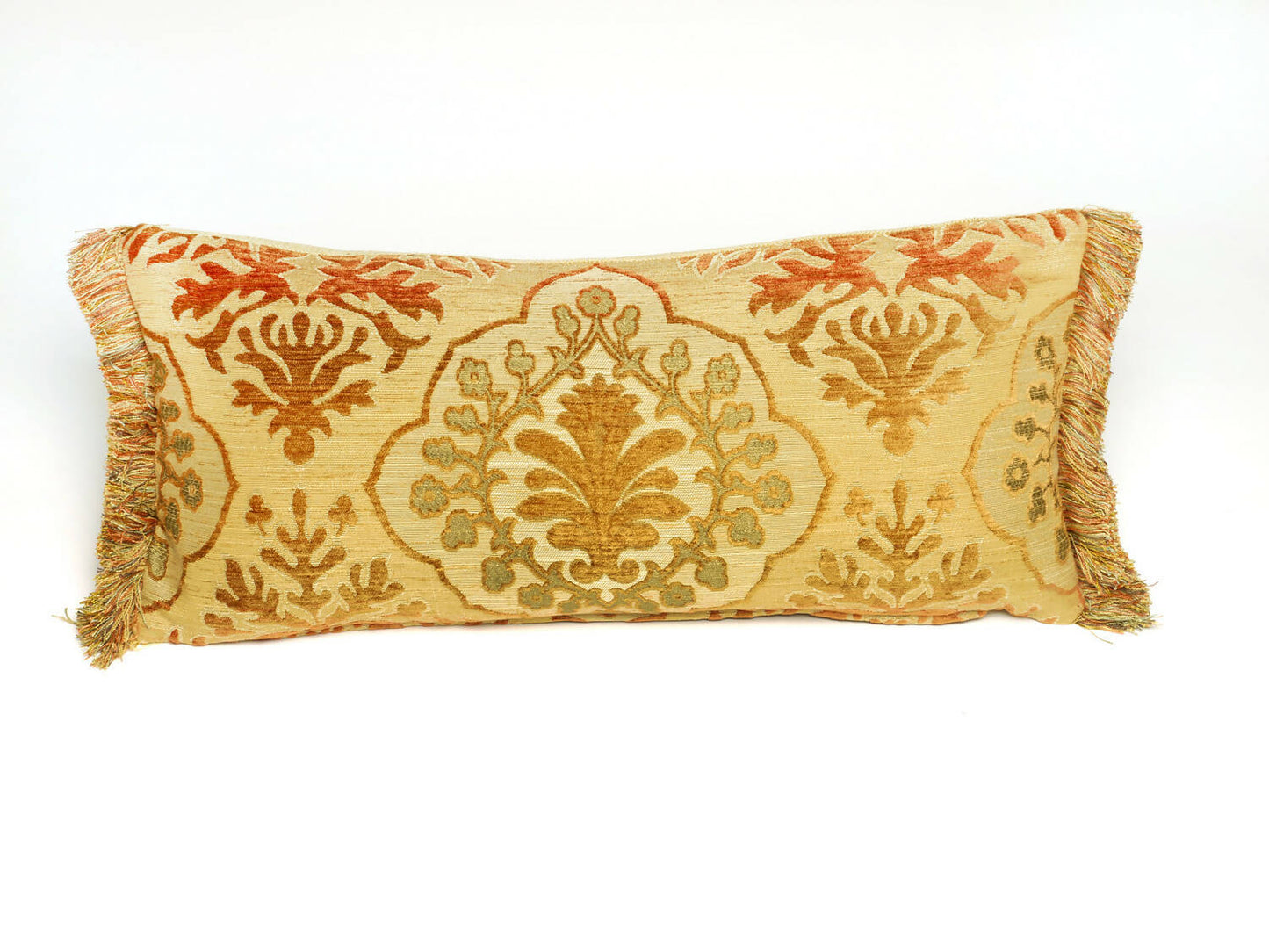 A raised chenille center medallion in subtle apricot and sage tones is flanked by bronze and rust motifs on a textured gold linen background. The same colors accent 2 ends in a 1.5" brush fringe. A rich gold chenille fabric backing and zippered bottom complete this 10.5" x 23" pillow cover. An insert can be provided for an additional charge.