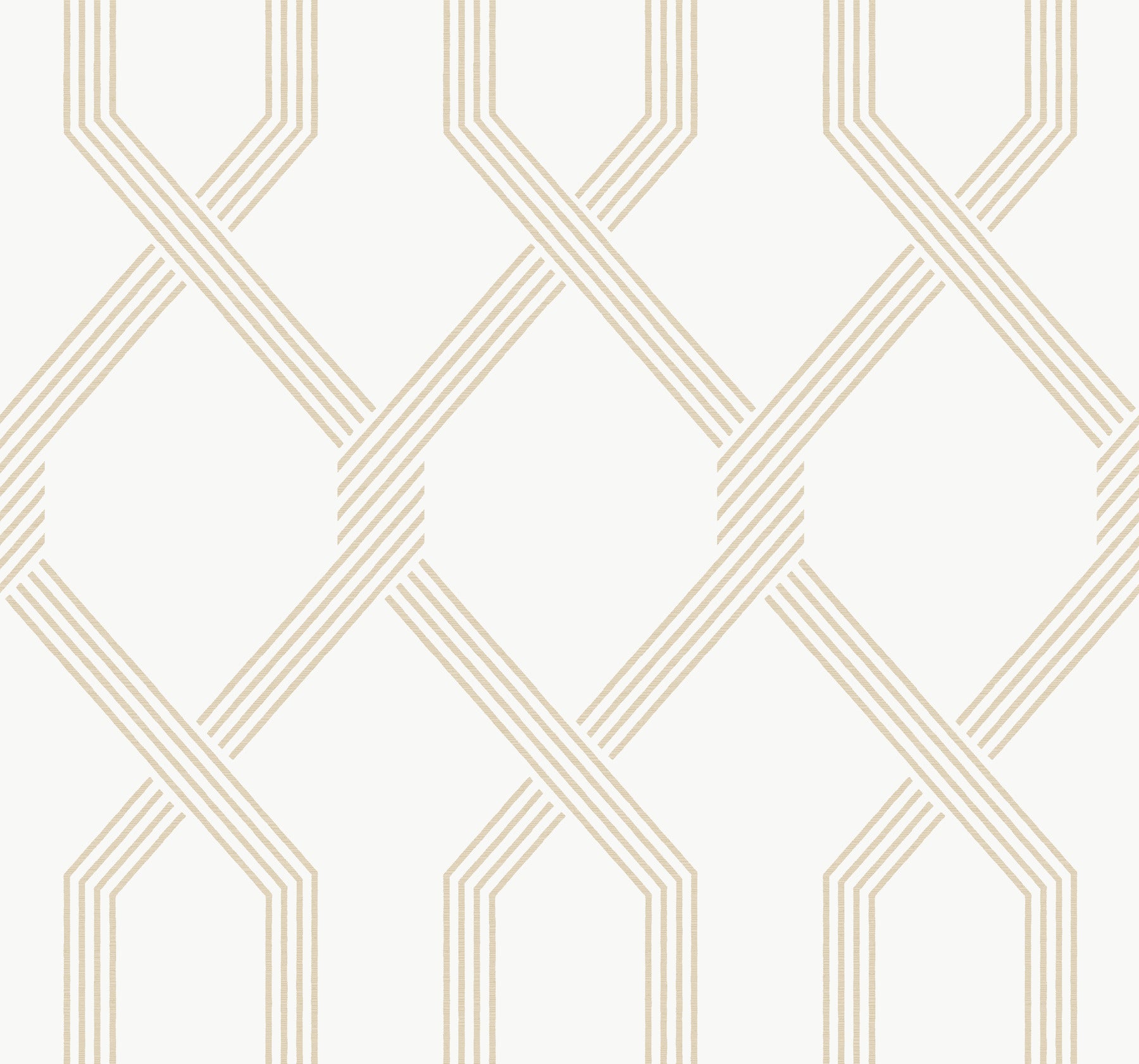 Use:Oversized diamonds within Palisade form as the geometric crossing of lines twist into a ribbon of angled stripes, shown in beige neutrals on white. This Palisade Wallpaper measures approximately 27 inches wide by 27 feet long, measuring approximately 60.8 square feet per roll. The distinction of timeless style.