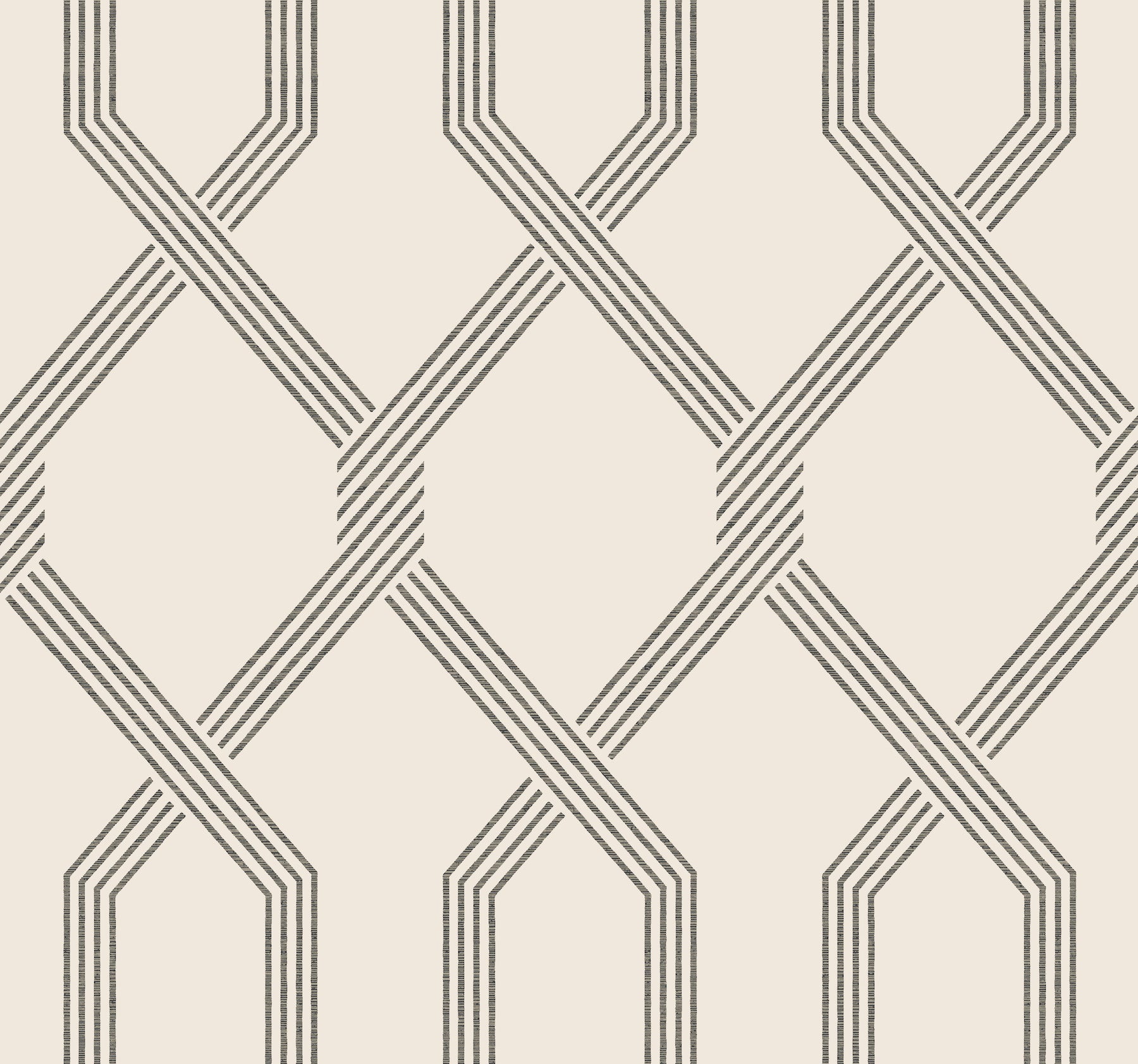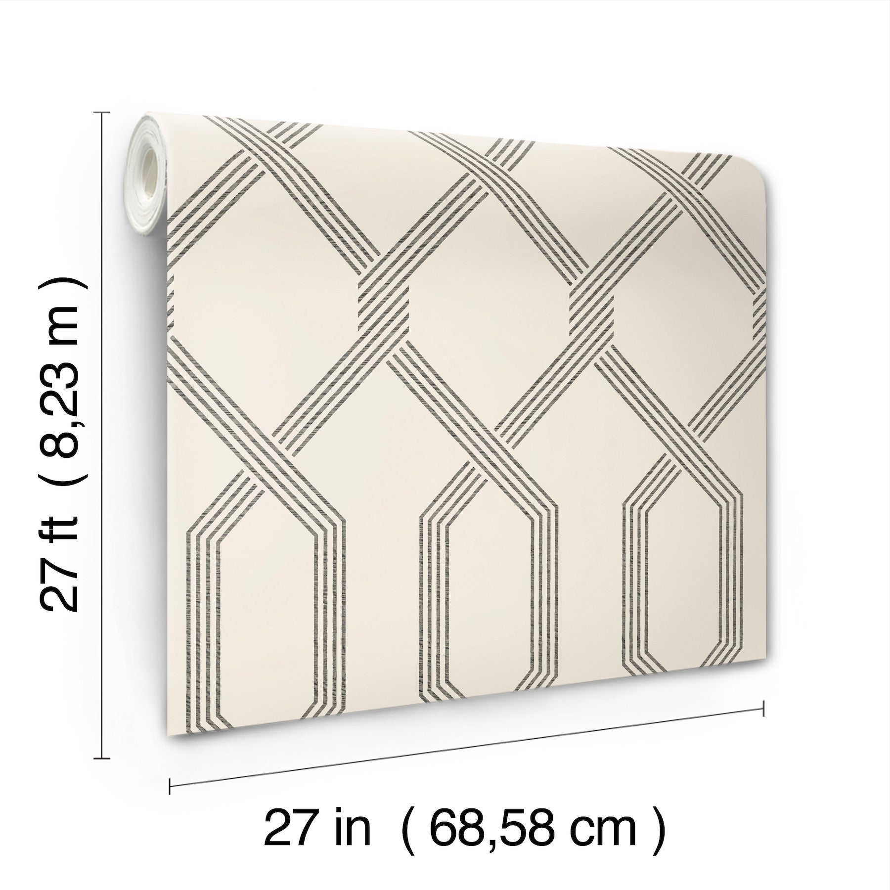 Use:Oversized diamonds within Palisade form as the geometric crossing of lines twist into a ribbon of angled stripes, shown in black on cream white. This Palisade Wallpaper measures approximately 27 inches wide by 27 feet long, measuring approximately 60.8 square feet per roll. The distinction of timeless style.