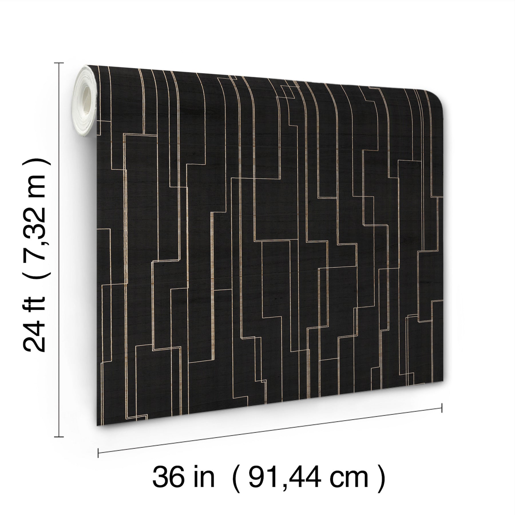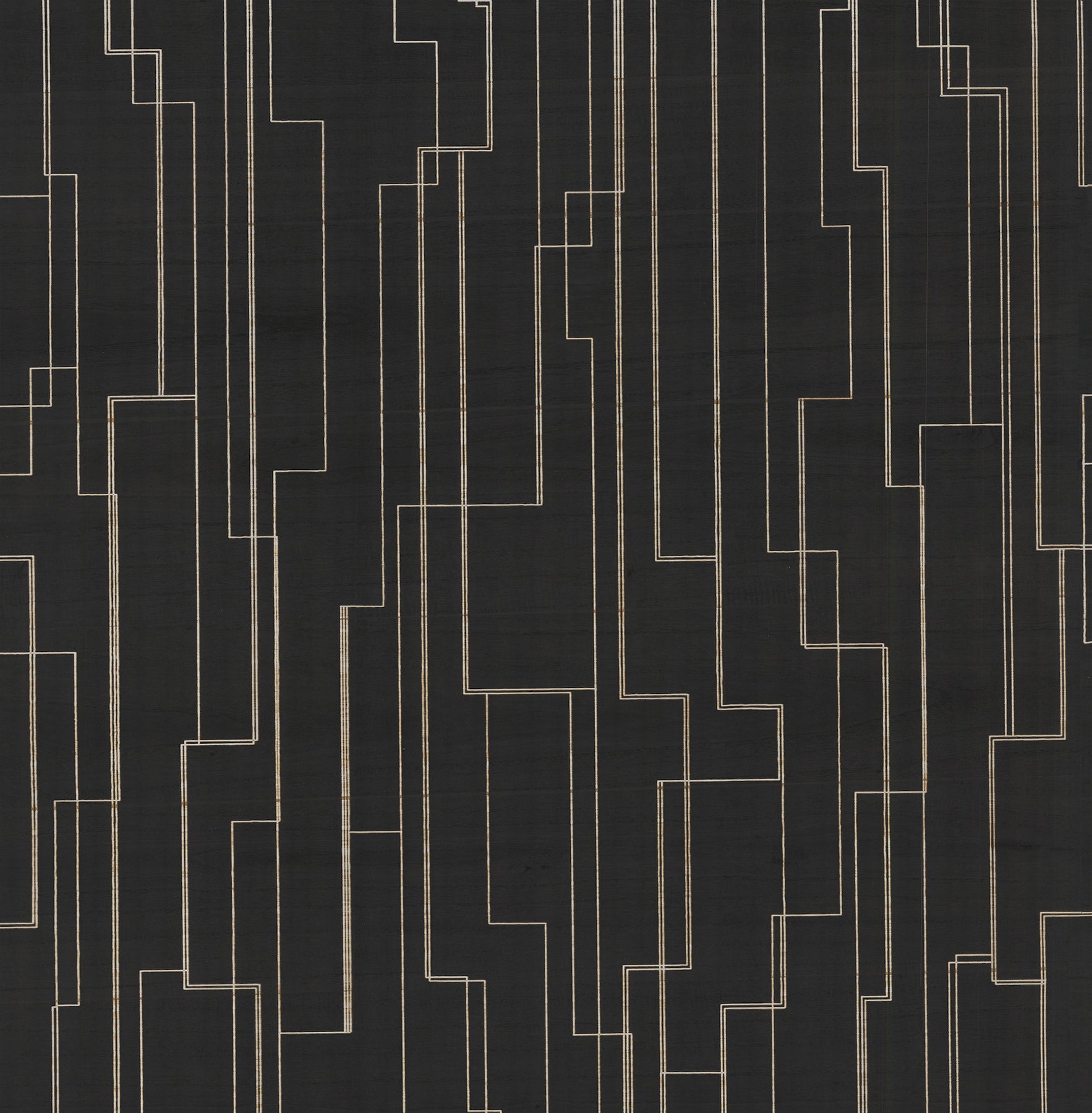 Use:Double and single metallic lines turn right angles, intersect, and then redirect back to an abrupt vertical drop in the authentic wood veneer of the pattern Inlay Line, in black with gold metallic. This Inlay Line Wallpaper measures approximately 36 inches wide by 24 feet long, measuring approximately 72 square feet per roll. A curated showcase of???luxurious natural materials. Discover grasscloth in every hue and texture alongside embellished wood veneers and naturally brilliant mica.
