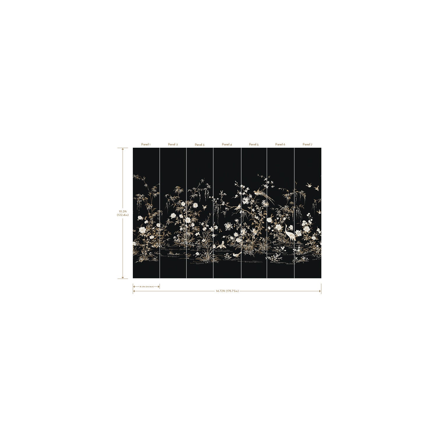 Use:The Asian scenic landscape of a wetland's botanicals and birds flourish against a backdrop of majestic metallic shimmer in Flowering Vine Chinoiserie Mural. This Flowering Vine Chino Wall Mural measures approximately 25.25 inches wide by 10.2 feet long, covering 7 panels - Measures 14-ft 7-in wide by 10-ft 2-in when assembled per roll. Ronald Redding wallcoverings artfully blend hertiage design with innovation to achieve the luxury of Modern Traditionalism. The 24 Karat collection exemplifies this blend of quiet sophisitcation and fine quality with the glamour of modern urban living.