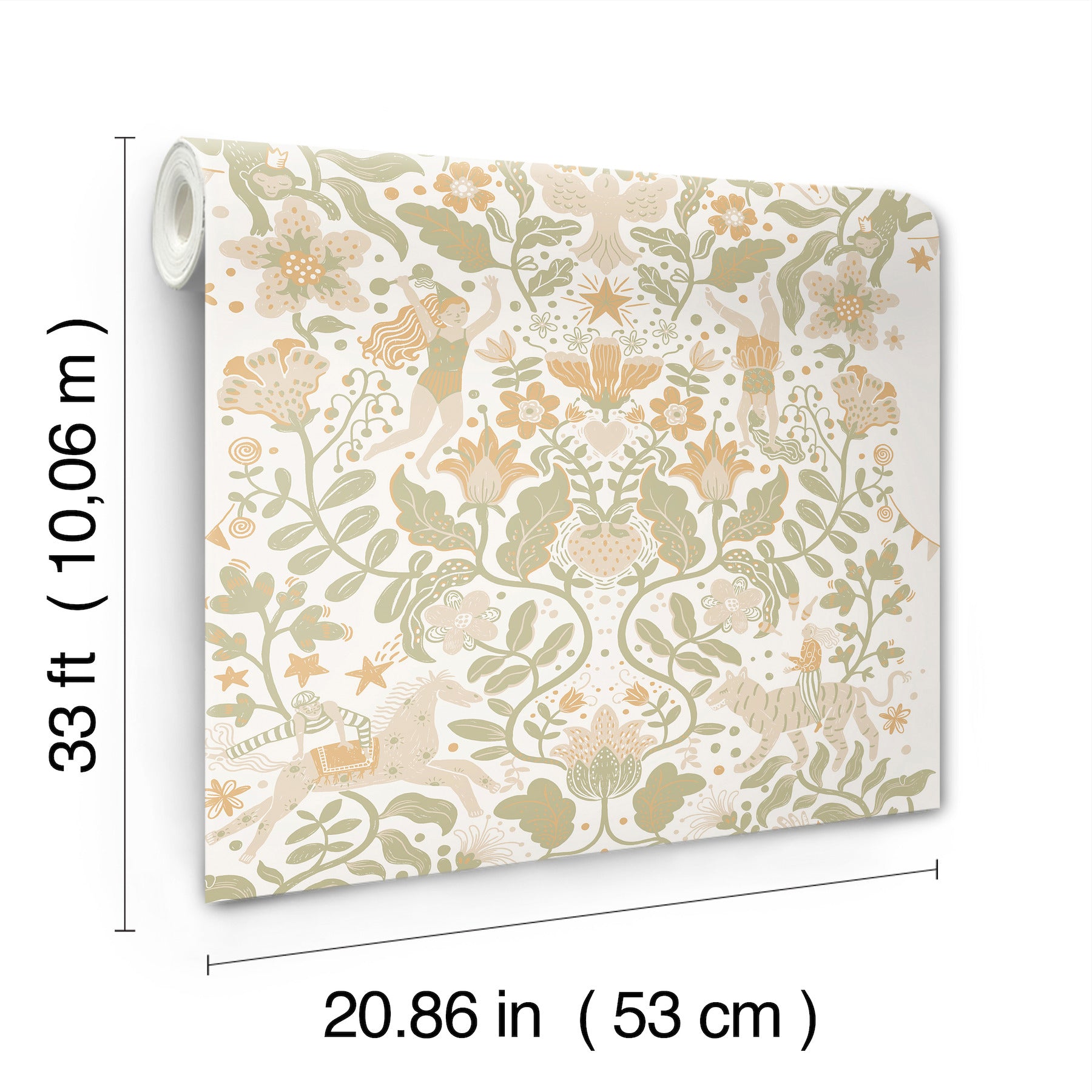 Use:This illustrative stripe revels in the marvels of the circus. Acrobats, jugglers, and other joyful performers and their animal companions make an appearance throughout the twining floral vines. Pictured here in a palette of mossy green, tangerine, beige, and white. This Cirkus Wallpaper measures approximately 20.9 inches wide by 33 feet long, measuring approximately 57.5 square feet per roll. Embark on a journey bursting with child-like wonder with Lina Schnaufer's collection, Daydream. The trip around the world features explorations on hot air balloons, train rides through the mountains, trips to the circus, and other whimsical adventures.