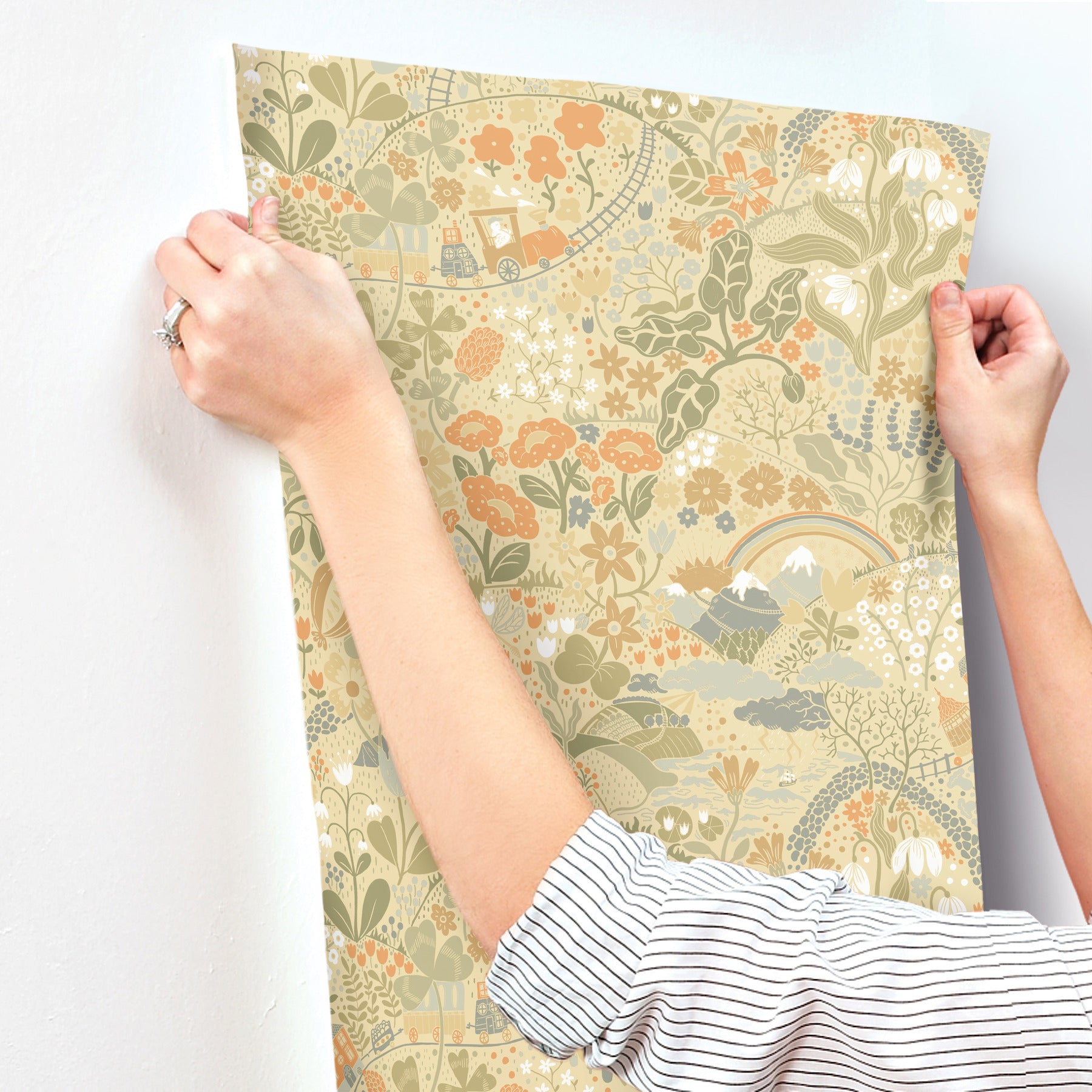 Use:A train winds through valleys bursting with lively flowers and up around snow-capped mountains crowned with rainbows in this illustrative exploration of lands high and low. Featured here in a warm and welcoming palette of golden yellow, ochre, greens, orange, white and blues. This Taget Wallpaper measures approximately 20.9 inches wide by 33 feet long, measuring approximately 57.5 square feet per roll. Embark on a journey bursting with child-like wonder with Lina Schnaufer's collection, Daydream. The trip around the world features explorations on hot air balloons, train rides through the mountains, trips to the circus, and other whimsical adventures.
