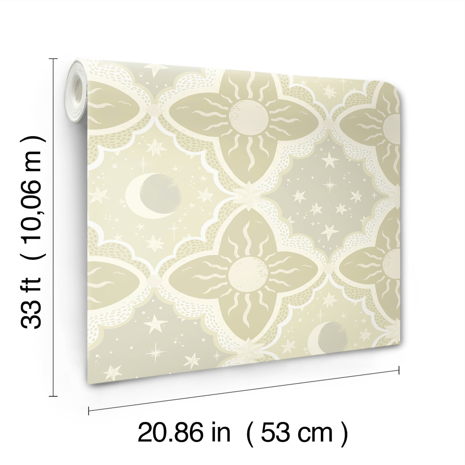 Use:This celestial quatrefoil celebrates the beauty of the skies, more particularly the sun, moon, and stars that shine day and night. Featured here in shades of sage, moss, steel grey, palest aqua, and light grey. This Sol and Mane Wallpaper measures approximately 20.9 inches wide by 33 feet long, measuring approximately 57.5 square feet per roll. Embark on a journey bursting with child-like wonder with Lina Schnaufer's collection, Daydream. The trip around the world features explorations on hot air balloons, train rides through the mountains, trips to the circus, and other whimsical adventures.