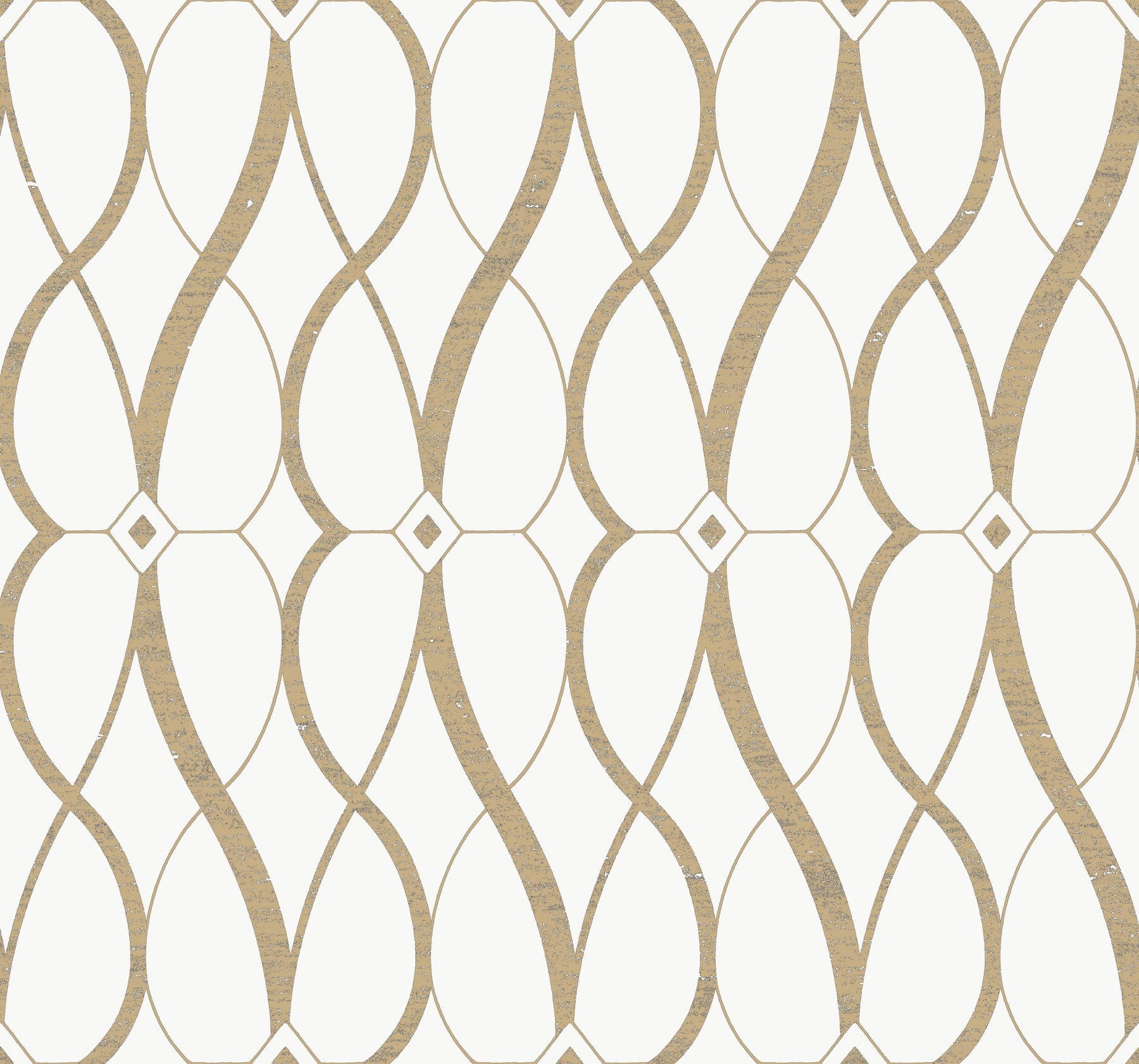 Use:Sinuous recurve lines and diamonds construct a romantic geometric of burnished, weathered metallic in pattern Graceful Geo, shown in Cream white on burnished gold metallic. This Graceful Geo Wallpaper measures approximately 27 inches wide by 26.9 feet long, measuring approximately 60.5 square feet per roll. The long awaited follow-up to the popular first release, Modern Metals Second Edition energizes contemporary spaces with charismatic visual artistry defined by the allure of luminous metallic.