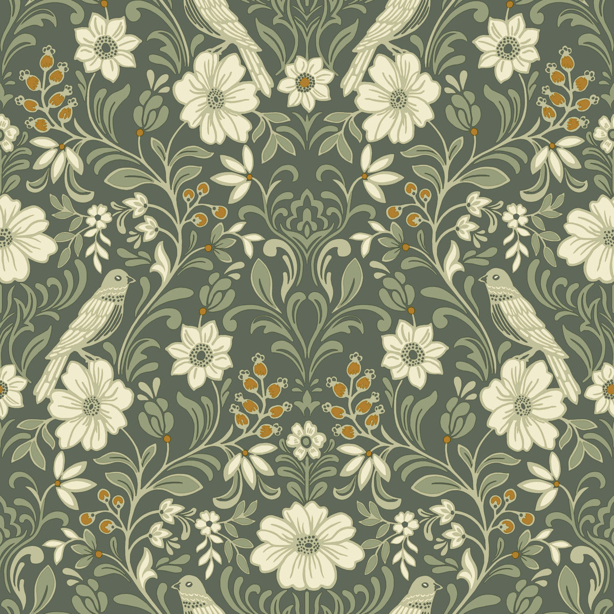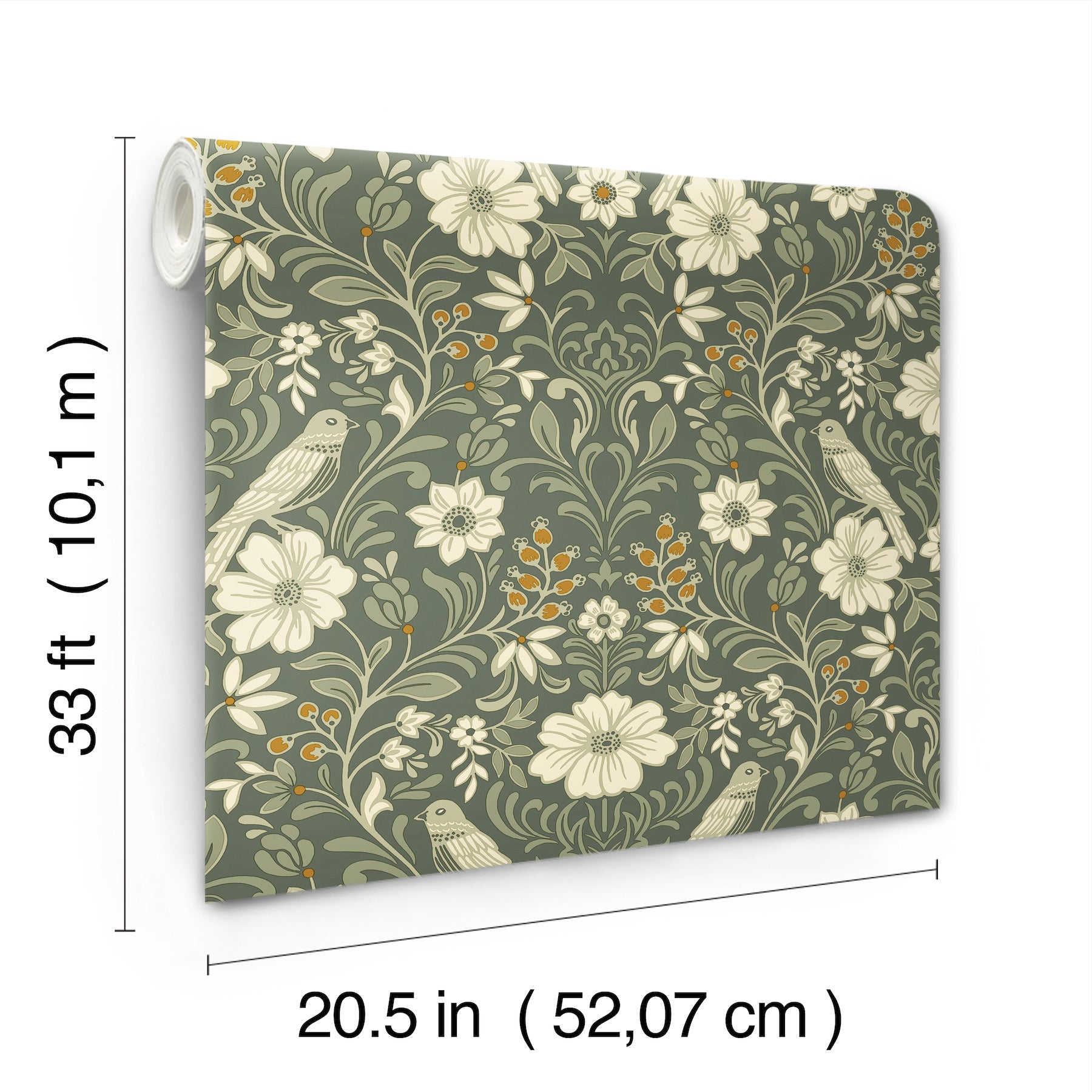 Use:Sparrows perch on flourishing blooms amid rich vines and ripe berries in this delightful woodland damask wallpaper.ring cream, sage, and terracotta detailing against an evergreen backdrop.??? This Colette Wallpaper measures approximately 20.5 inches wide by 33 feet long, measuring approximately 56.4 square feet per roll. This collection of timeless wallcoverings is layered with warmth and charm, and effortlessly blends nostalgic patterns with modern designs.s assortment has a little bit of everything,simple stripes, subtle plaids, vintage motifs, and bold florals.