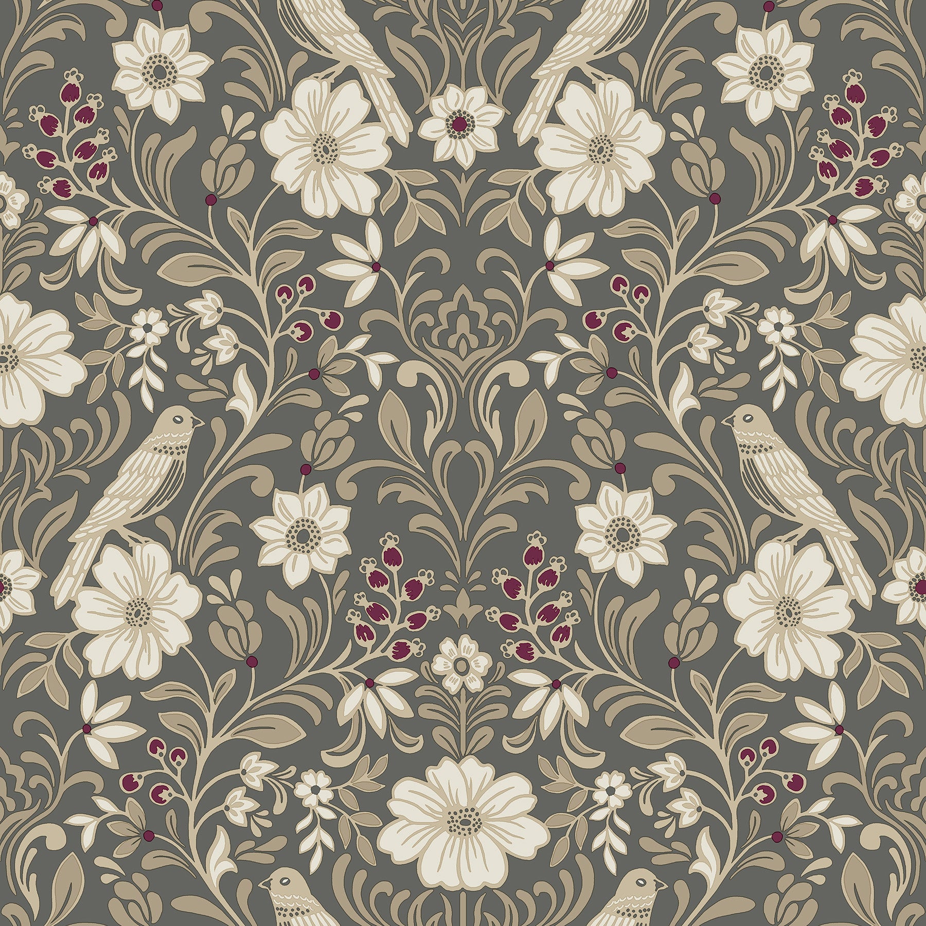 Use:Sparrows perch on flourishing blooms amid rich vines and ripe berries in this delightful woodland damask wallpaper. Featuring white, taupe, beige, and mulberry detailing against a charcoal backdrop.?¨ This Colette Wallpaper measures approximately 20.5 inches wide by 33 feet long, measuring approximately 56.4 square feet per roll. This collection of timeless wallcoverings is layered with warmth and charm, and effortlessly blends nostalgic patterns with modern designs.?¨This assortment has a little bit of everything?simple stripes, subtle plaids, vintage motifs, and bold florals.