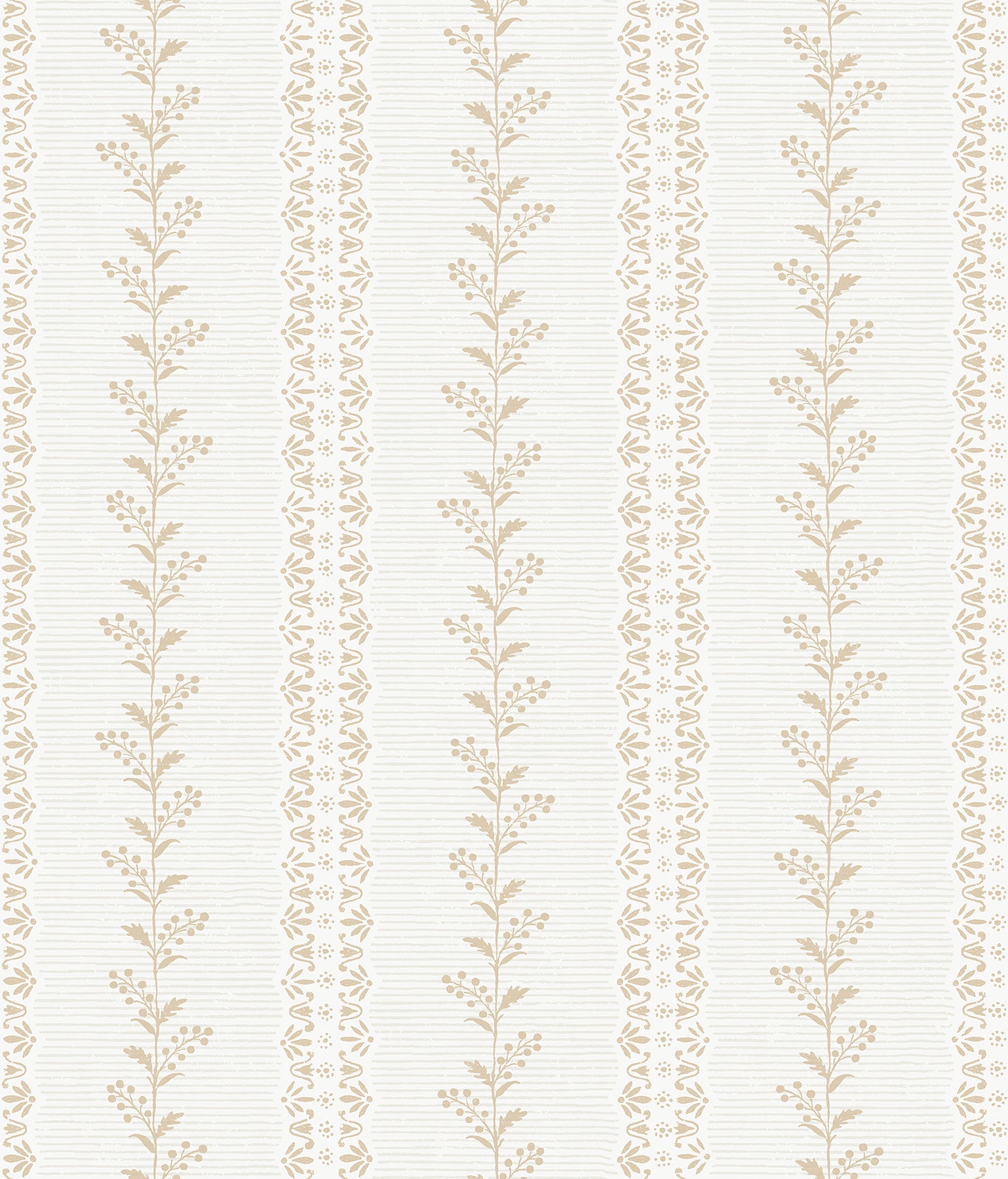 Use:An elevated striped design with nods to nature. Wide columns of delicately lined detailing are overlaid with climbing, berry-laden vines and floral stamps for a scalloped interlude. Featuring a simple palette of ochre and white. This Everleigh Wallpaper measures approximately 20.5 inches wide by 33 feet long, measuring approximately 56.4 square feet per roll. This collection of timeless wallcoverings is layered with warmth and charm, and effortlessly blends nostalgic patterns with modern designs.?¨This assortment has a little bit of everything?simple stripes, subtle plaids, vintage motifs, and bold florals.