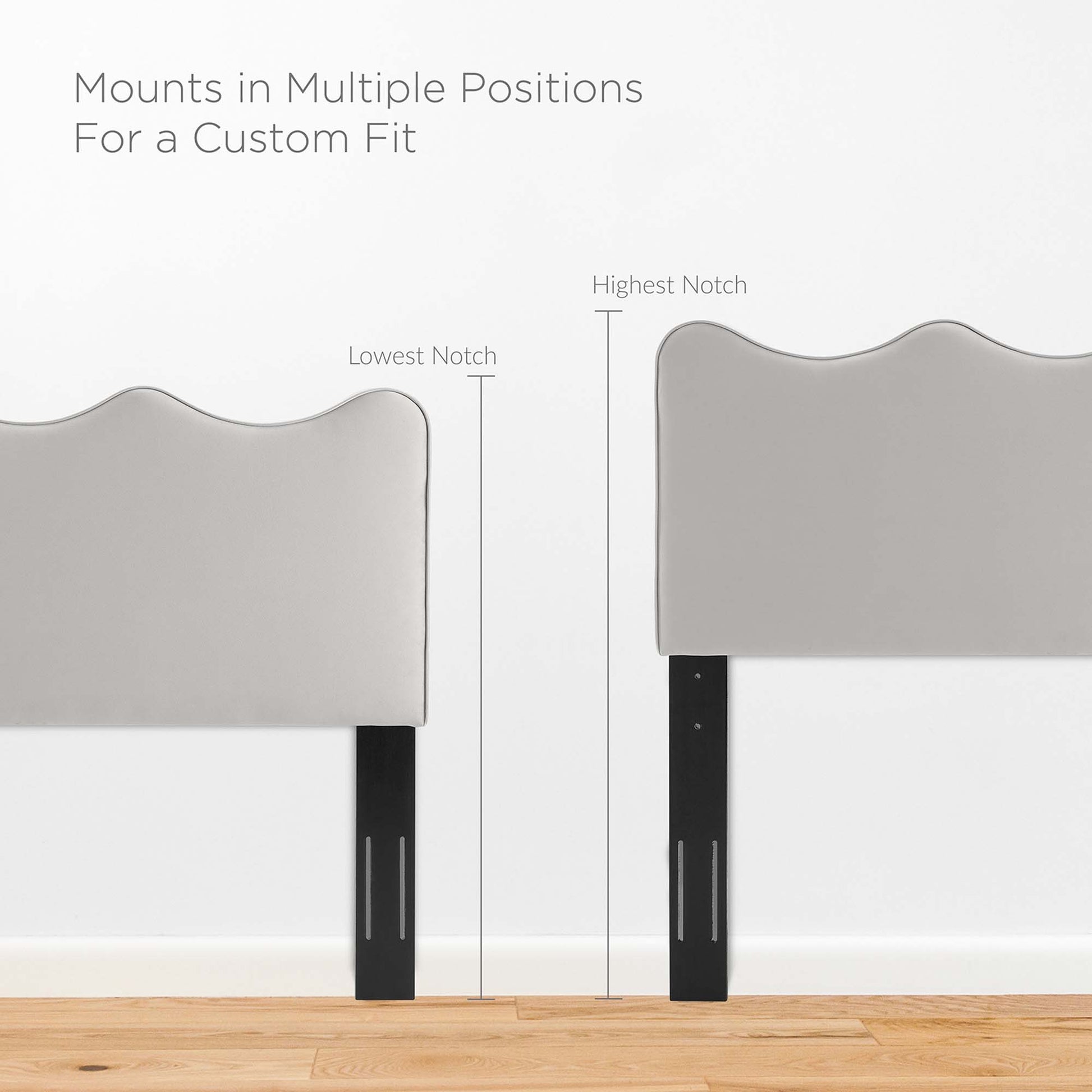 Use:Bring the imagery of waves crashing against the shore to a master bedroom or guest suite with the Current Performance Velvet King Platform Bed. Putting a modern twist on a classic scalloped design, the king headboard of this platform bed features luxe texture and a silhouette inspired by the ocean waves while dense padding offers a supportive place to sit back and relax while sitting up in bed. Covered in stain-resistant performance velvet, this upholstered bed frame is a sturdy mattress foundation for memory foam, innerspring, latex, and hybrid mattresses. Eliminating the need for a box spring, the MDF frame of this king bed is complete with a wood slat support system crafted with poplar for lasting durability and support. This slatted bed frame rests on black wood legs with non-marking foot caps and includes a reinforced center beam with two support legs for enhanced stability. Assembly required. Weight Capacity: 800 lbs.