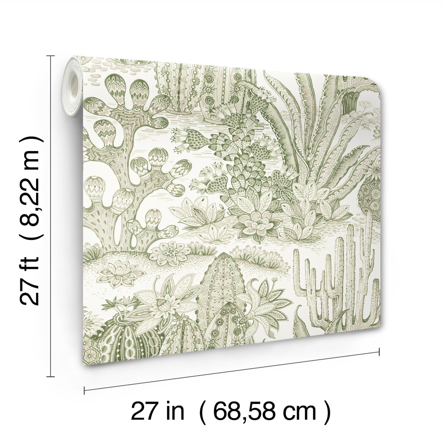 Use:Lotus Land Cacti's richly patterned, desert-dwelling plants are an artistic representation of the beauty of arid climes. The design is inked in rich greens accented by taupe against crisp white. This Lotus Land Cacti Wallpaper measures approximately 27 inches wide by 27 feet long, measuring approximately 60.8 square feet per roll. California?s scenic vistas and luxurious, laid-back lifestyle inspires this sun-drenched collection of organic textures and breezy botanical designs.