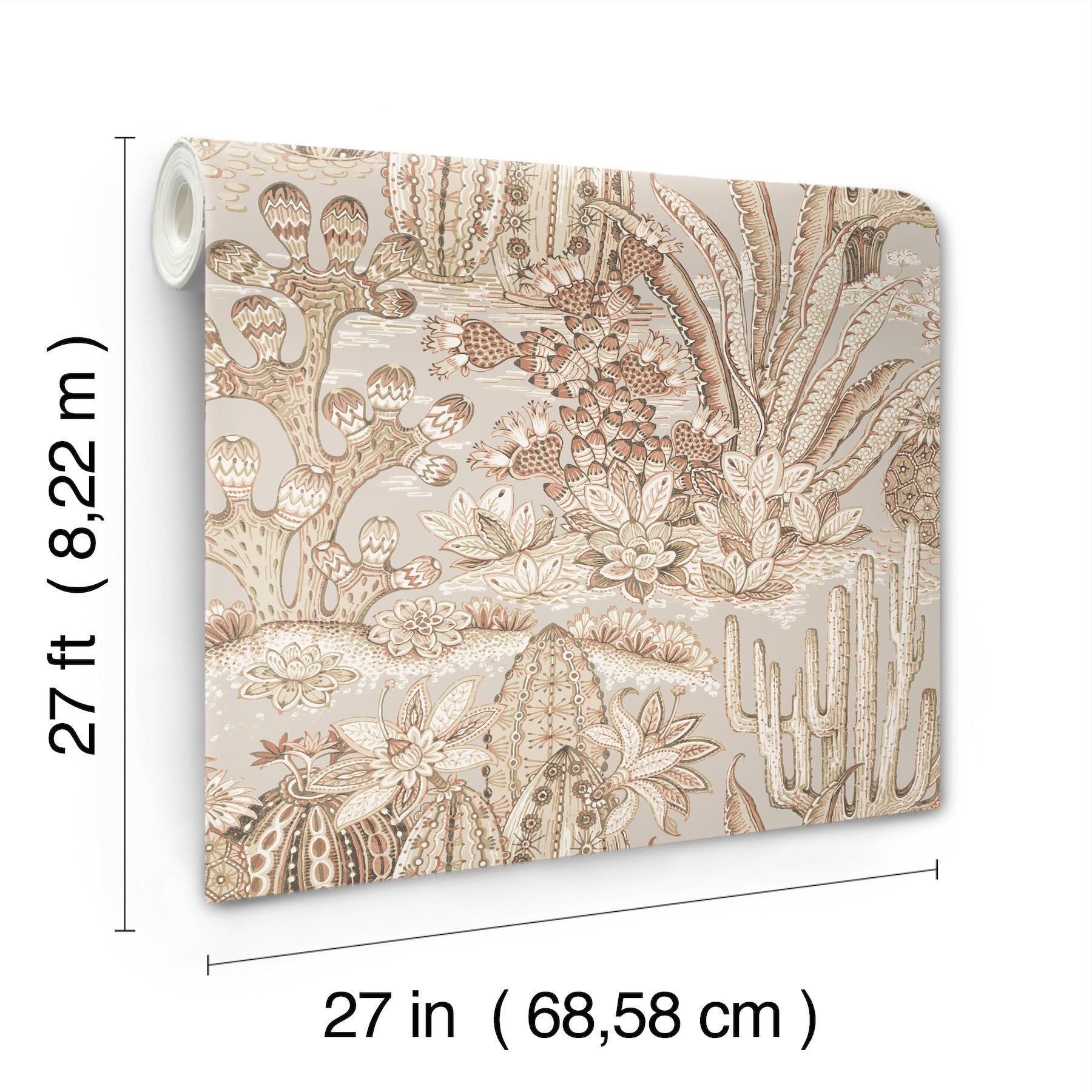 Use:Lotus Land Cacti's richly patterned, desert-dwelling plants are an artistic representation of the beauty of arid climes. The design is inked in terracotta, brown, taupe, and white against pale grey. This Lotus Land Cacti Wallpaper measures approximately 27 inches wide by 27 feet long, measuring approximately 60.8 square feet per roll. California?s scenic vistas and luxurious, laid-back lifestyle inspires this sun-drenched collection of organic textures and breezy botanical designs.