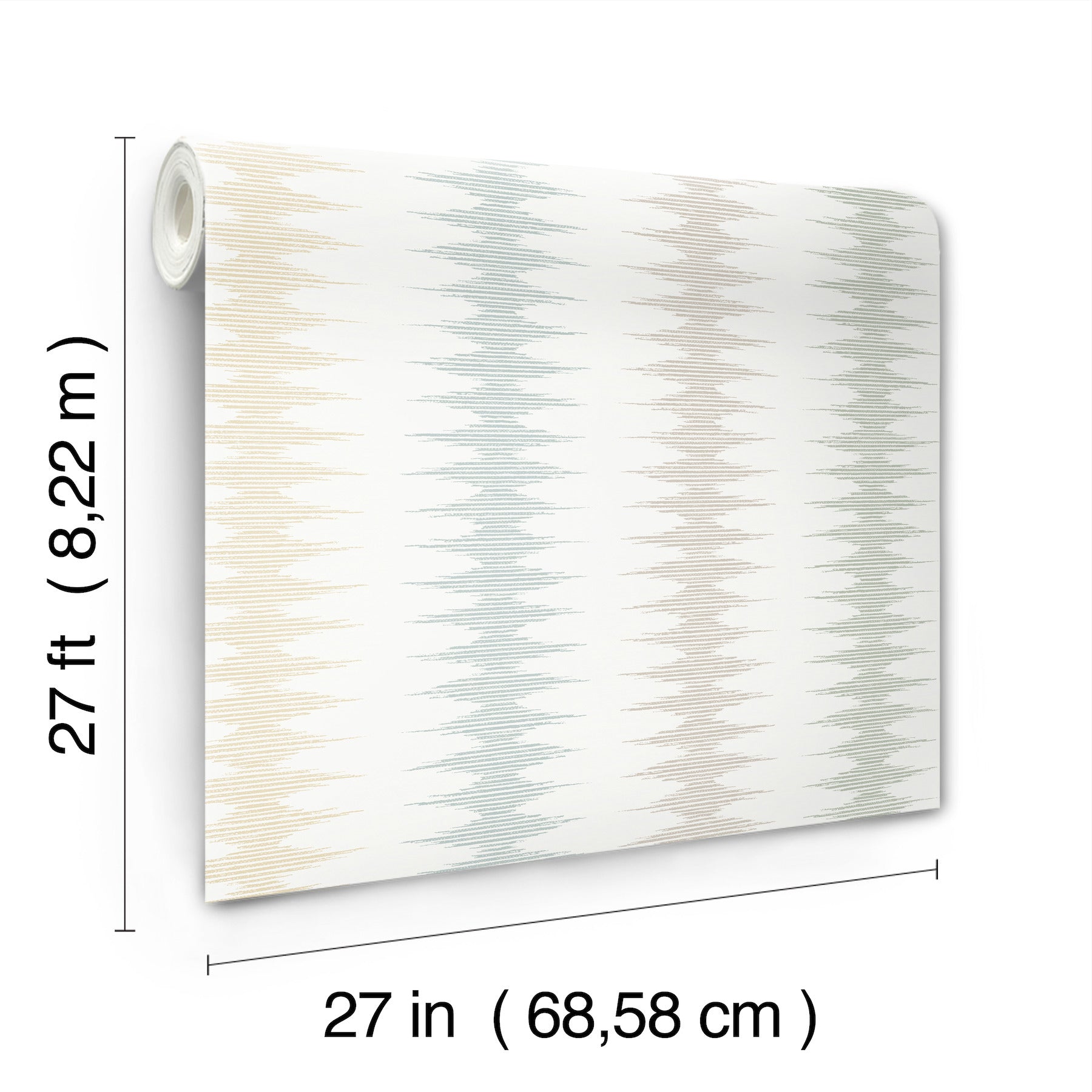 Use:Woven Desert's oversized pattern features a series of loomed, serrated stripes that cycle through ochre, teal, beige, and sage. This Woven Desert Wallpaper measures approximately 27 inches wide by 27 feet long, measuring approximately 60.8 square feet per roll. California?s scenic vistas and luxurious, laid-back lifestyle inspires this sun-drenched collection of organic textures and breezy botanical designs.