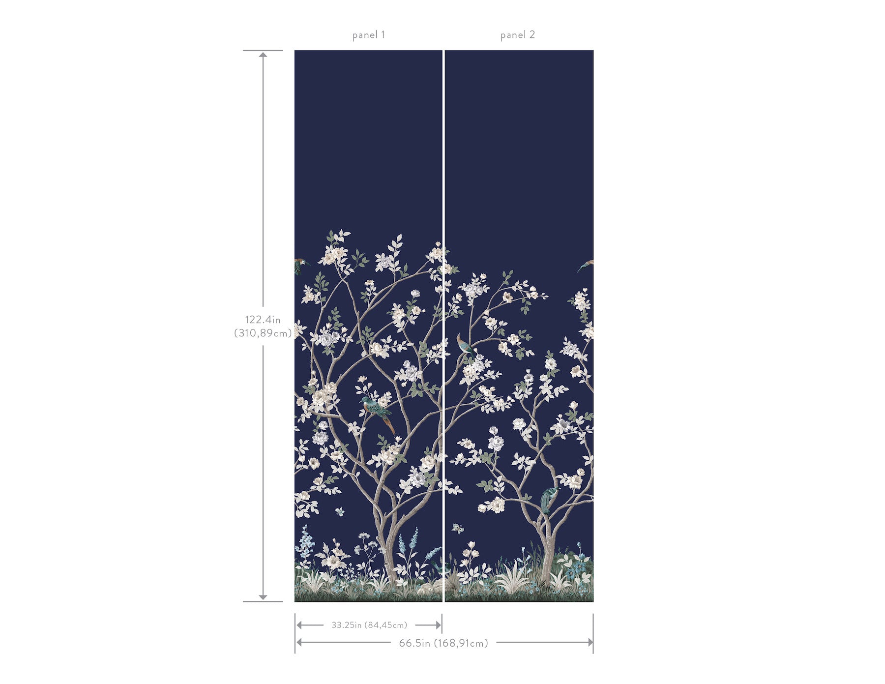 Use:Asian motifs and Japanese gardens define the timeless beauty of the Lingering Garden Mural, shown here in navy blue with greeen, white, and natural accents. This Lingering Garden Wall Mural contains 2 panels that each measure 33.25-in wide, measuring approximately 5.5-ft wide by 10.2-ft tall when assembled. The distinction of timeless style.