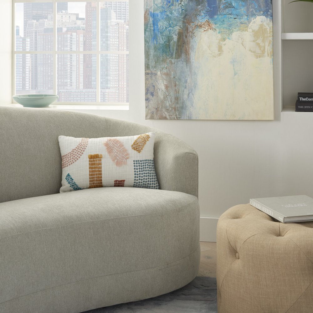 12" X 20" Beige Blue and Ivory Geometric Cotton Throw Pillow With Textured Appliques