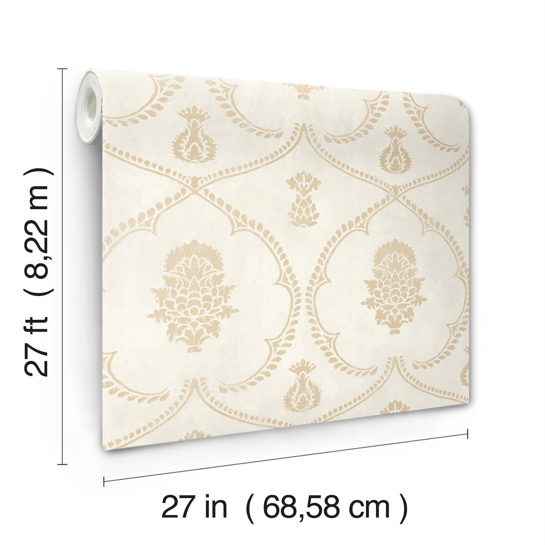 Use:Petite and grand botanical medallions are encircled by swooping frames embellished with simple leaves in pattern Royal Damask. Seen here in a palette of pale metallic gold and cream. This Royal Damask Wallpaper measures approximately 27 inches wide by 27 feet long, measuring approximately 60.8 square feet per roll. Traditional and timeless meets modern refinement, with artfully crafted designs redefined in striking color palettes.