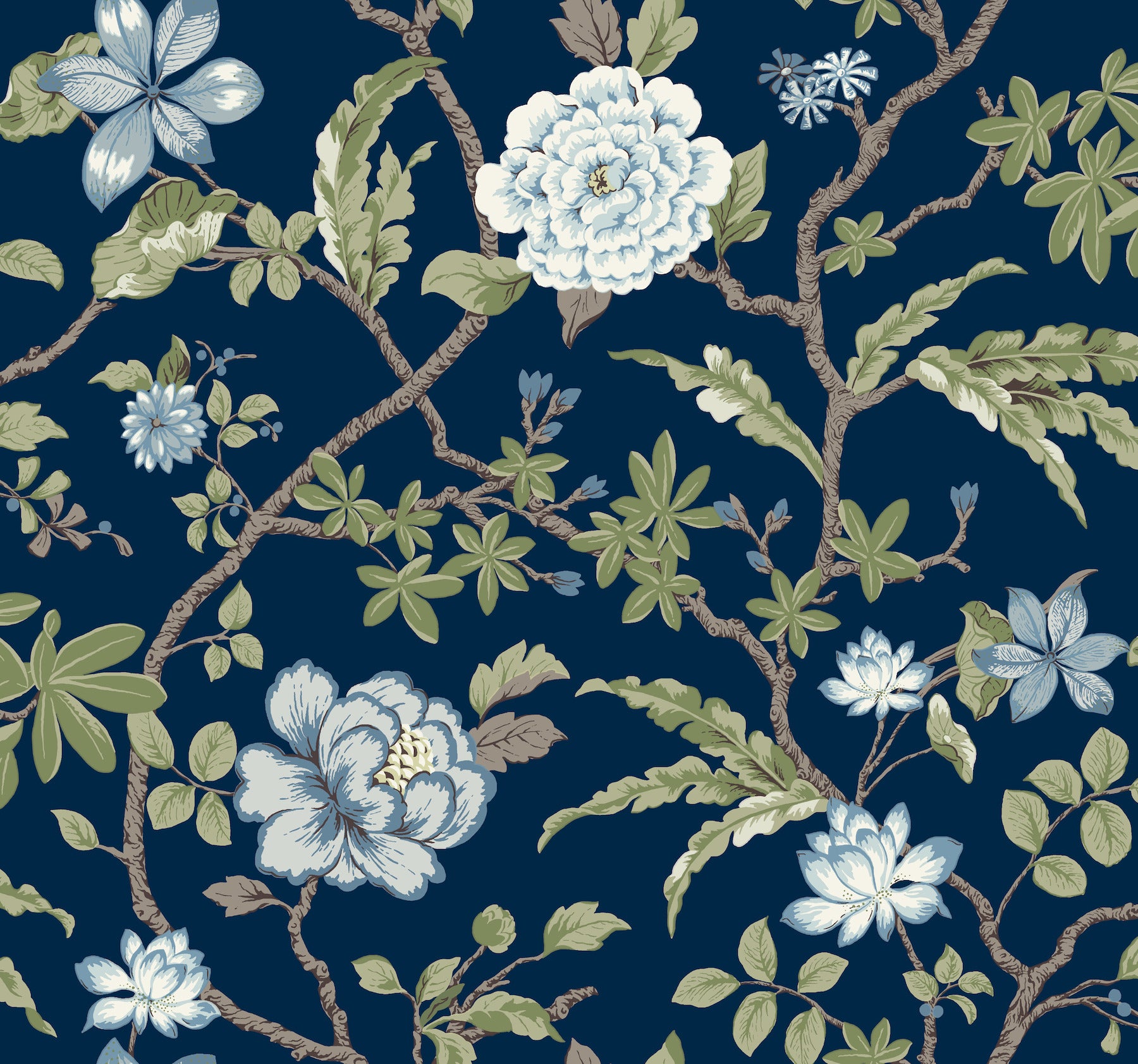 Use:Twisting branches sport a diverse array of lush leaves and voluminous blooms in stately Courtyard Botanical. Featured here in a palette of denim, moss, sage, taupe, white, brown, and navy. This Courtyard Botanical Wallpaper measures approximately 27 inches wide by 27 feet long, measuring approximately 60.8 square feet per roll. Traditional and timeless meets modern refinement, with artfully crafted designs redefined in striking color palettes.