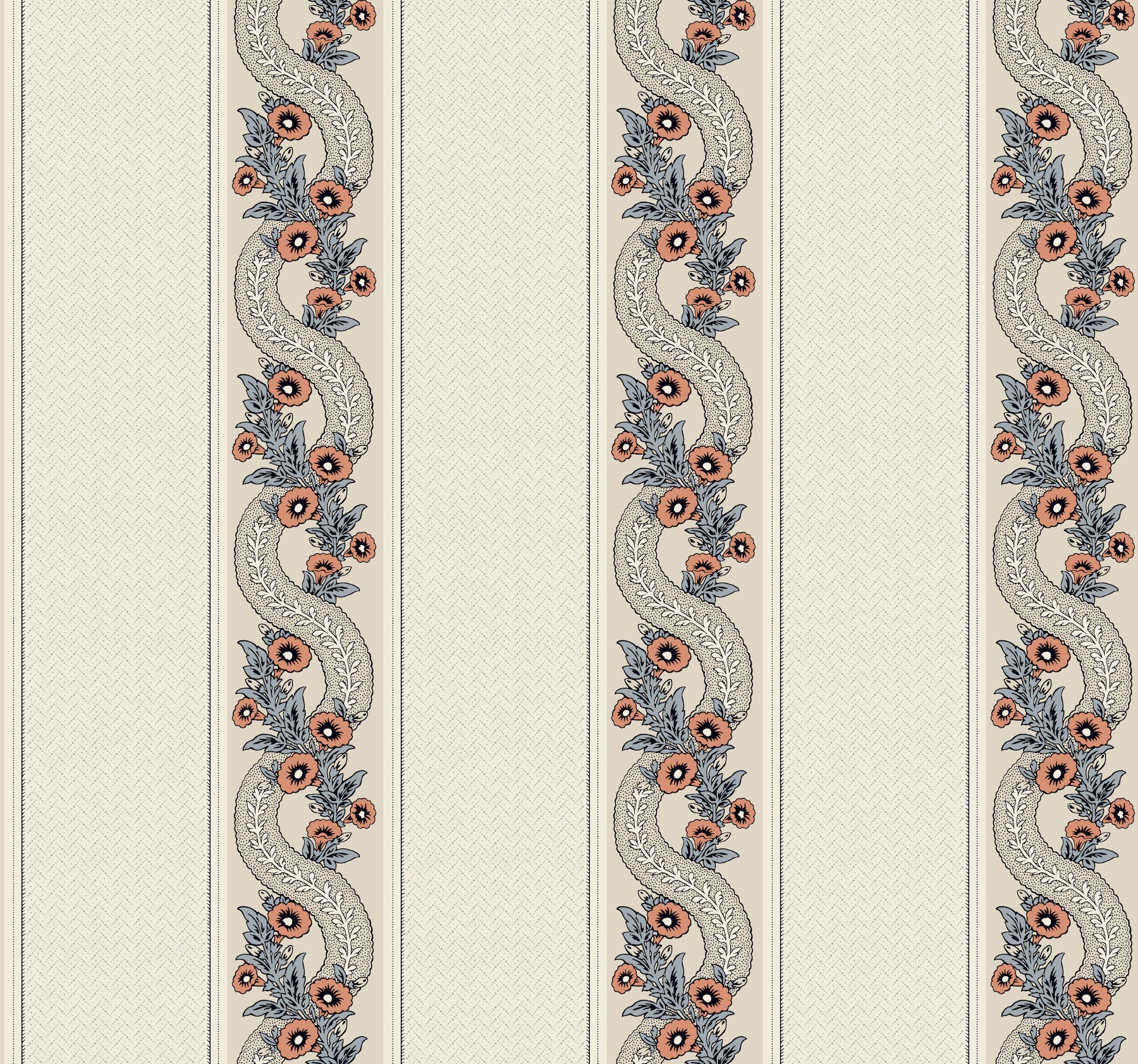 Use:Intertwining columns of vines and campanula flowers alternate with wide bands embellished with dotted zigzags in pattern Abbey's Garland. Featured here with coral blooms, blue vines, and beige stippling against a cream ground. This Abbey's Garland Wallpaper measures approximately 27 inches wide by 27 feet long, measuring approximately 60.8 square feet per roll. Traditional and timeless meets modern refinement, with artfully crafted designs redefined in striking color palettes.