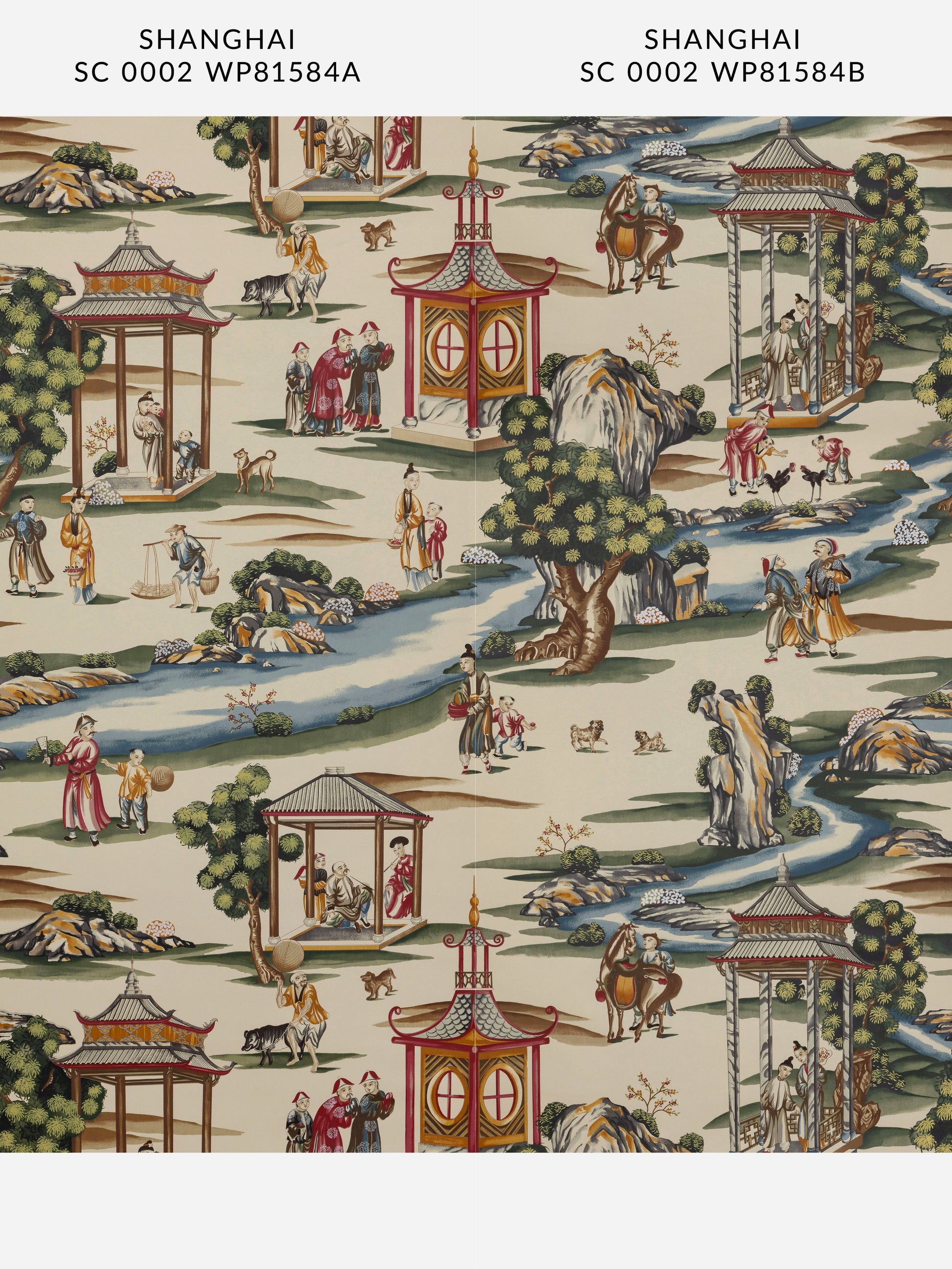 SCALAMANDRE SHANGHAI BOTANICAL , FOLIAGE CHINOISERIE SCENIC TOILE MULTI ON TEA STAIN - A - SC 0002WP81584A NEW SKU # SCWP81584A0002