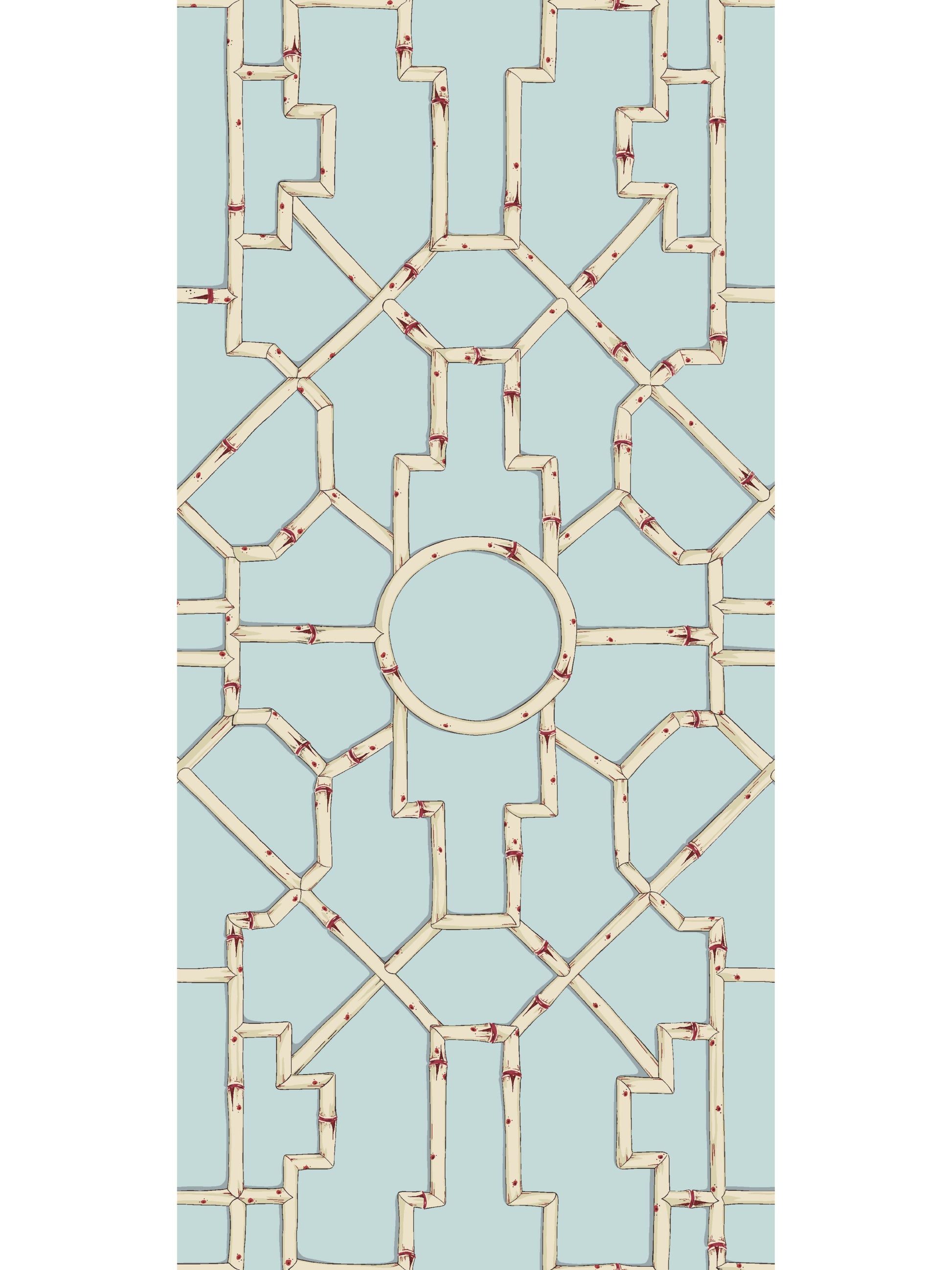 SCALAMANDRE BALDWIN BAMBOO CHINOISERIE FRETWORK , LATTICE CREAM & RED ON AQUA - SC 0004WP81630 NEW SKU # SCWP816300004
