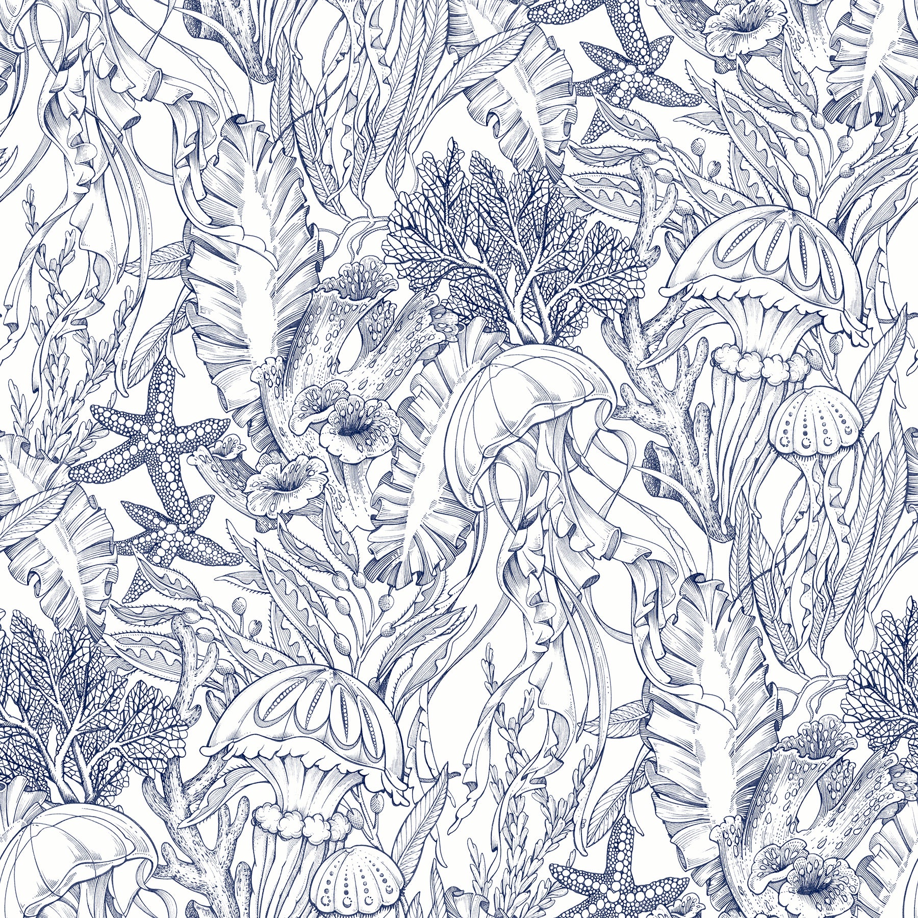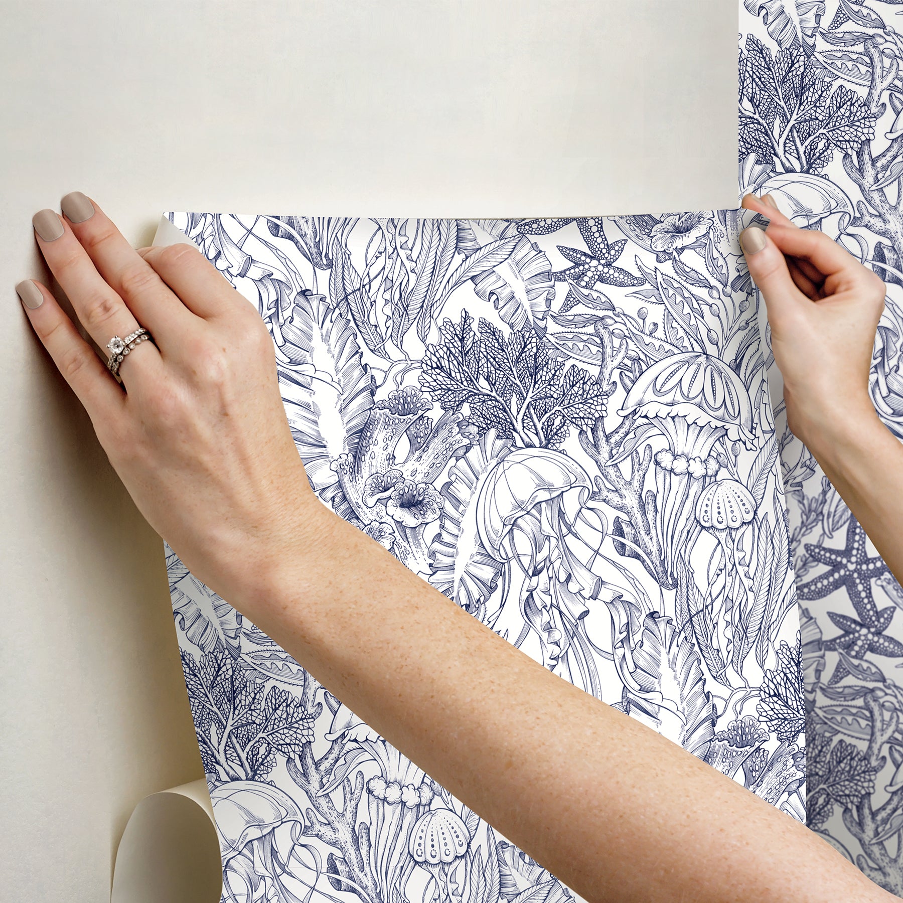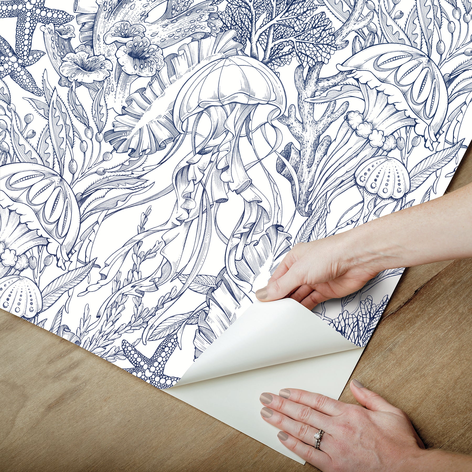 Use:Bring the wonder of the ocean to your walls with this intricately illustrated peel and stick wallpaper. Featuring jellyfish, coral, seaweed, and starfish in a classic navy-on-white colorway, this design captures the elegance of antique marine biology prints with a modern twist. Perfect for creating a serene, seaside atmosphere in bathrooms, bedrooms, or any space that could use a splash of the sea. Under the Sea Navy Blue Peel and Stick Wallpaper comes on one roll that measures 20.5 inches wide by 18 feet long. Illustrative seascape peel and stick wallpaper in shades of navy and white; Peel and stick to apply, pull up to remove; NuWallpaper is safe for walls and leaves no sticky residue behind; Easily repositionable while installing; NuWallpaper sticks to any smooth, flat surface - perfect for DIY projects; Ideal for rental or home decorating; Comes on a 20.5-in x 18-ft roll and covers about 30.75 sq. ft; Design repeat of 20.5-in; This product should NOT be applied to textured walls - smooth clean, dry, painted surface only (no Non-Stick paint or soap residue).