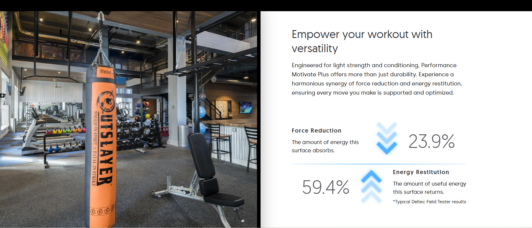 Engineered for light strength and conditioning, Performance Motivate Plus offers more than just durability. Experience a harmonious synergy of force reduction and energy restitution, ensuring every move you make is supported and optimized.