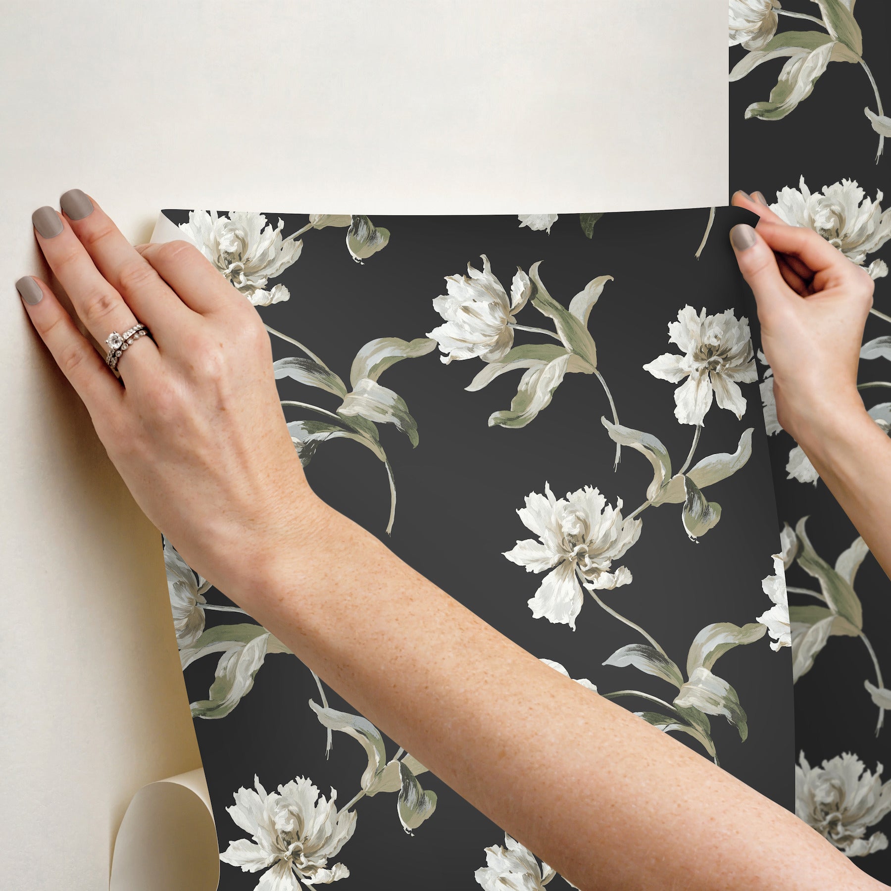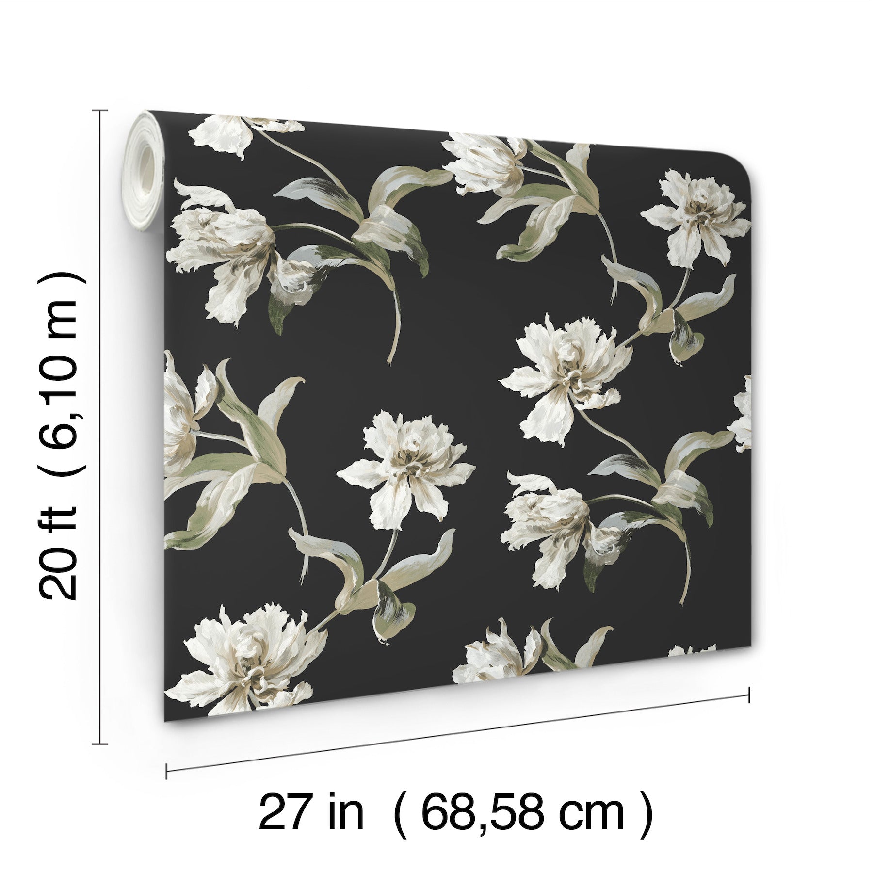 Use:A lovely toss of flowers and stems makes pattern Large Parrot Tulip the perfect accent for adding charming elegance, the white blooms and sage-green richly offset by black. This Large Parrot Tulip Peel and Stick Wallpaper measures approximately 27 inches wide by 20 feet long, measuring approximately 45 square feet per roll. Heritage botanical beauty is inspired by forests, fields, and gardens in bloom.