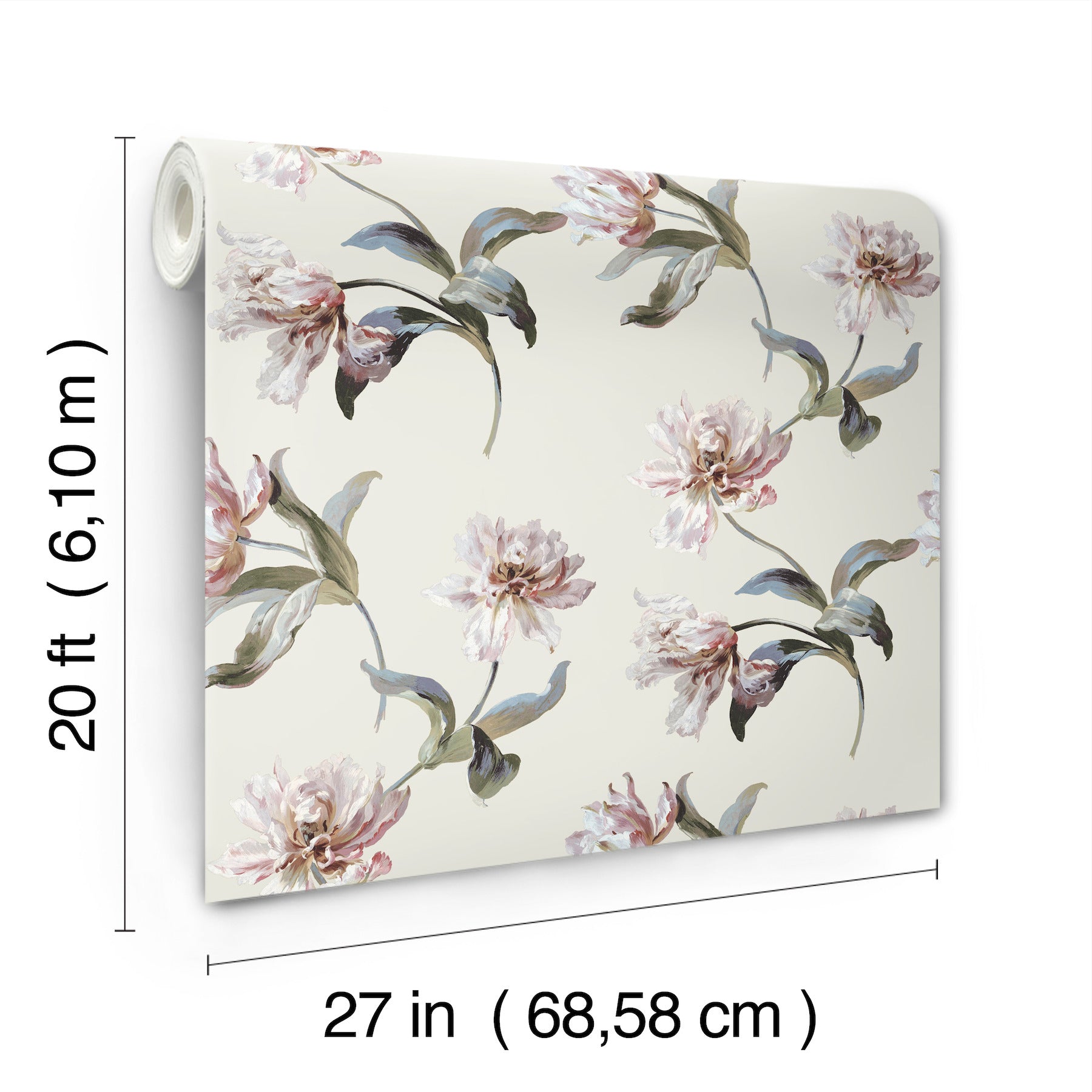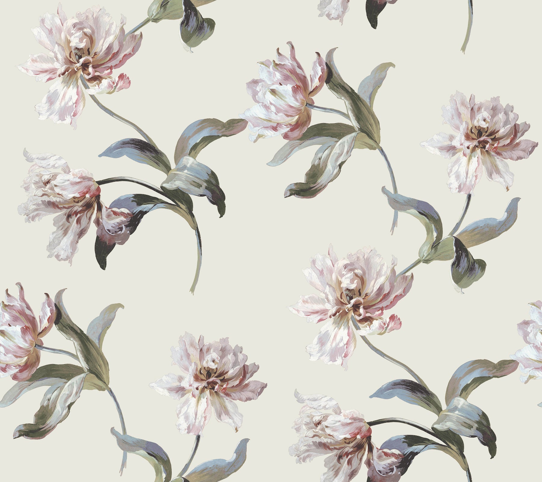 Use:A lovely toss of flowers and stems makes pattern Large Parrot Tulip the perfect accent for adding charming elegance, the white and pink blooms and blue-tinged greenery softly offset by pale beige. This Large Parrot Tulip Peel and Stick Wallpaper measures approximately 27 inches wide by 20 feet long, measuring approximately 45 square feet per roll. Heritage botanical beauty is inspired by forests, fields, and gardens in bloom.