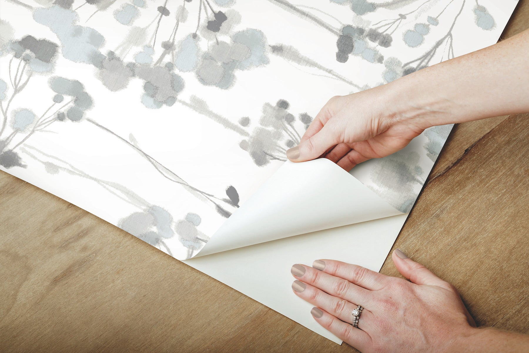 Use:Artistic watercolors of sky blue and sterling silver bring airy lightness to this color selection. This sheer blue and grey flourish peel and stick wallpaper measures 27 inches wide by 20 feet long, covering approximately 45 square feet per roll. Candice Olson?s celebrated signature of current yet timeless design inspires these popular additions to her Premium Peel + Stick product offering. This is Simply Candice.