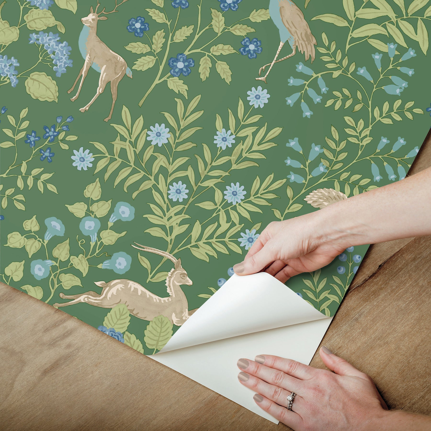 Use:The colorful blossoms, leaves, and stems provide a blanketed forest thicket for the Arts and Crafts-inspired antlered deer and plumed peacocks of the Woodland Floral pattern, shown in meadow green with florals in bluebell blue. This Woodland Floral Peel and Stick Wallpaper measures approximately 27 inches wide by 20 feet long, measuring approximately 45 square feet per roll. The Erin and Ben Co.? collection is filled with beautiful florals, vintage botanicals, and whimsical folk-art inspirations, lending a personal touch to help build a layered, nostalgic home design.