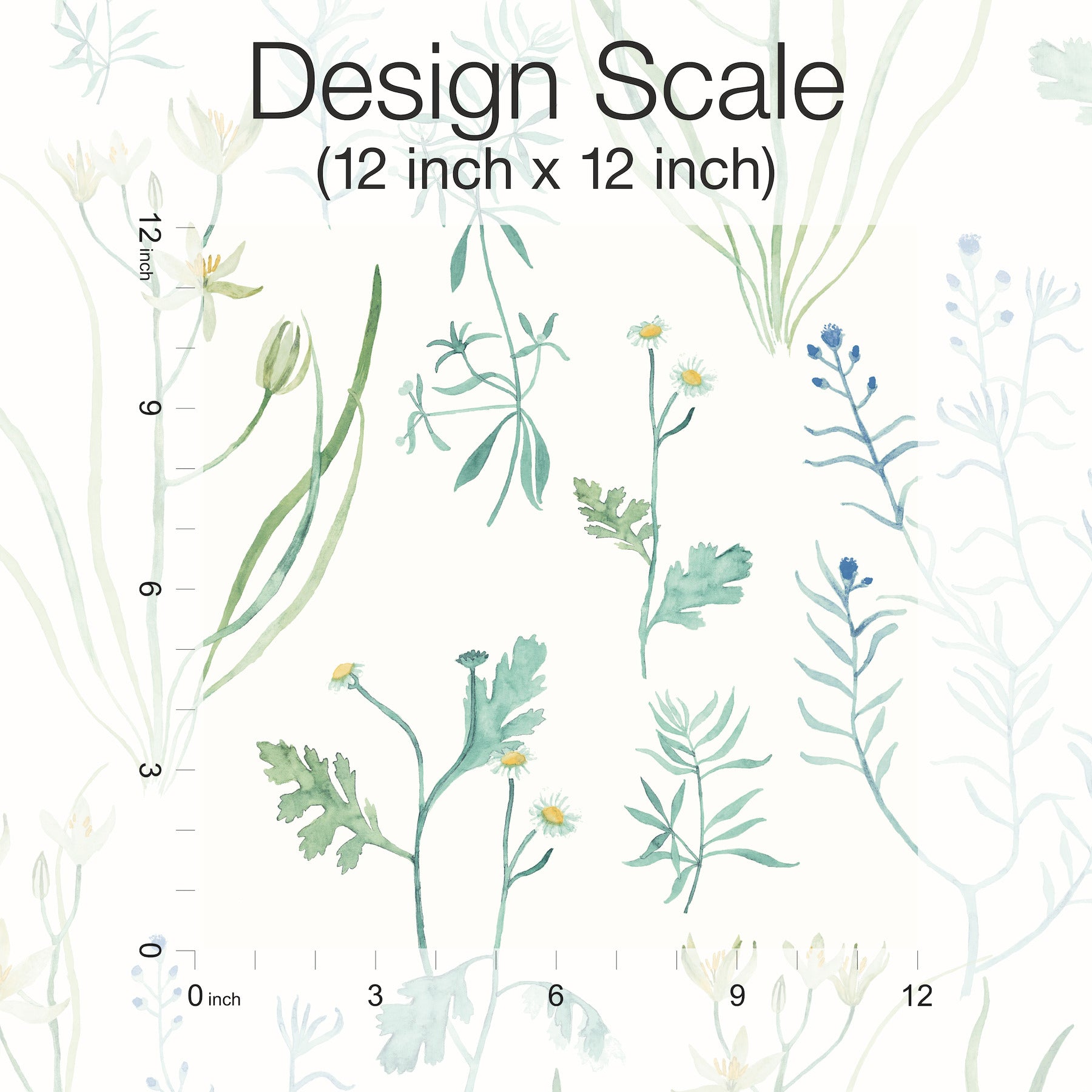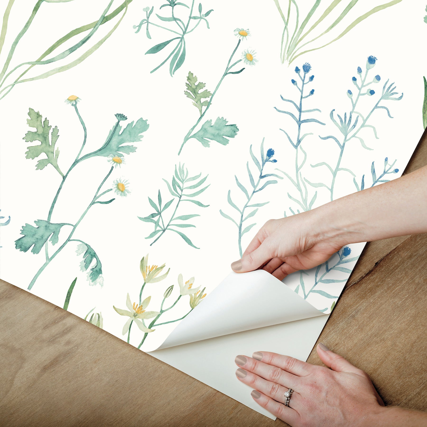 Use:The watercolor sprigs, stems, and flowers of the pattern Alpine Botanical float free in a lively toss of color and gentle motion, shown in river blue and grass green This Alpine Botanical Peel and Stick Wallpaper measures approximately 20.5 inches wide by 20 feet long, measuring approximately 34.2 square feet per roll. Painterly illustrations of meadows, gardens, and greenery.