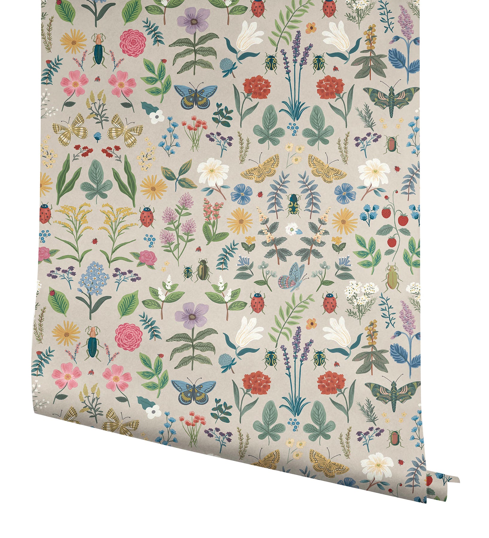 Use:This playful pattern celebrates all the delicate flora and fauna of a summertime meadow, the insects and flowers illustrated in a rainbow's worth of hues against warm taupe. This Curio Peel and Stick Wallpaper measures 27 inches wide by 20 feet long, measuring approximately 45 square feet per roll. The Premium Peel and Stick collection from Rifle Paper Co. is a bright and beautiful way to make a statement at home. Featuring their signature florals, elegant linework, and charming illustrations, these wallcoverings are designed to bring unexpected beauty into the real world.