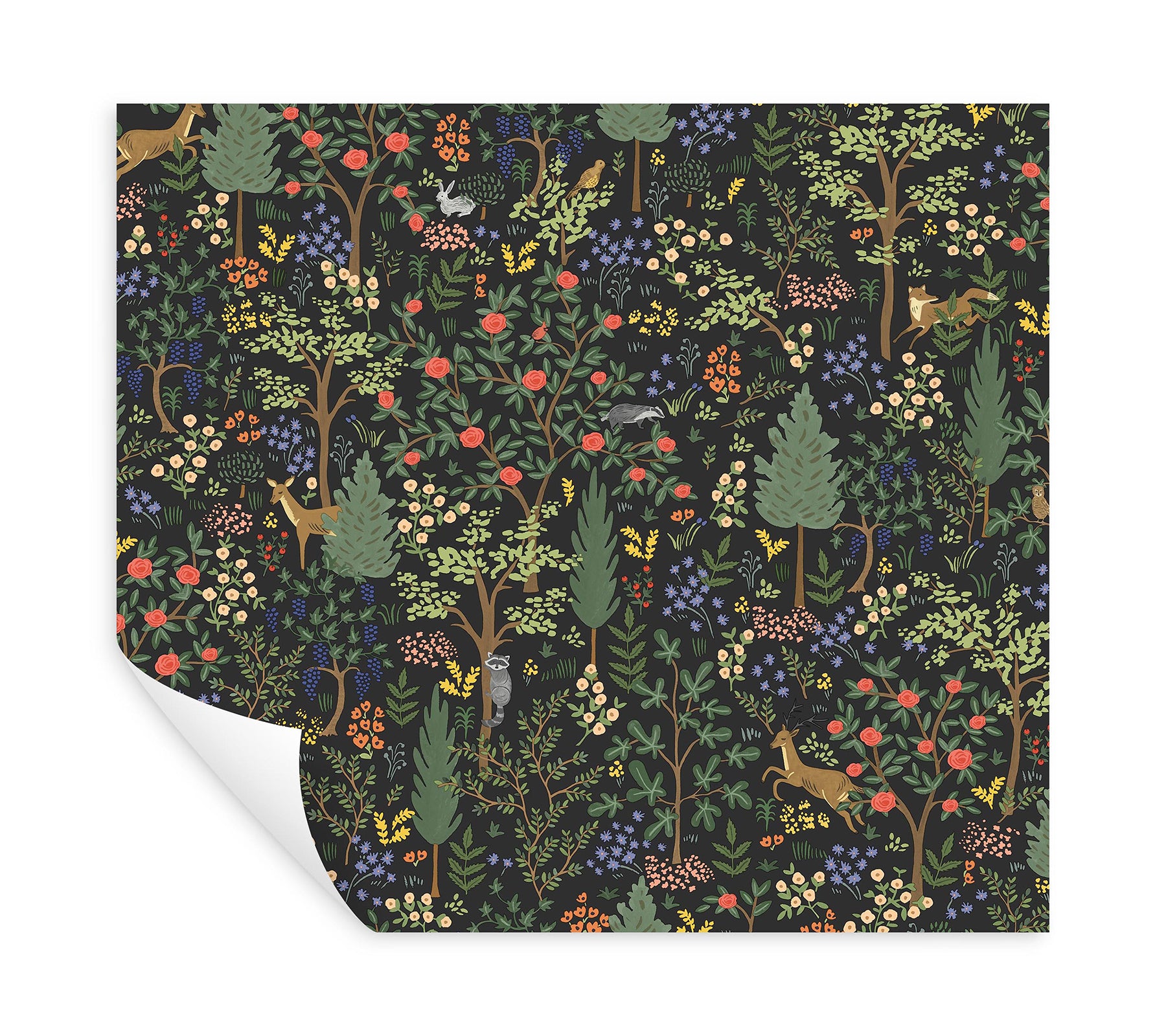 Use:Enchanting Woodland's scenic design features lush trees, wildflowers, and furry forest residents inked in rainbow hues against rich black. This Woodland Peel and Stick Wallpaper measures 27 inches wide by 20 feet long, measuring approximately 45 square feet per roll. The Premium Peel and Stick collection from Rifle Paper Co. is a bright and beautiful way to make a statement at home. Featuring their signature florals, elegant linework, and charming illustrations, these wallcoverings are designed to bring unexpected beauty into the real world.