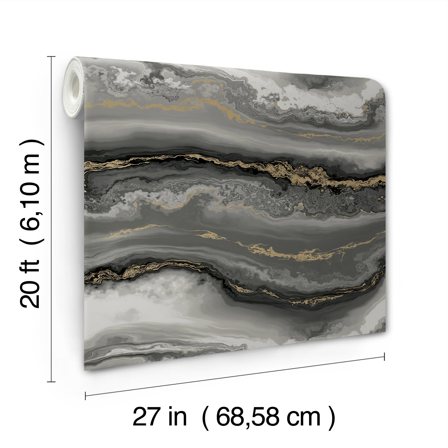 Use:Smoky, rolling waves of color accented by mineral shine mimic drifts?¨of?¨Shifting Sands?¨in a pattern with the unhurried motion of quiet tides, shown in black onyx with gold metallic. This Shifting Sands Peel and Stick Wallpaper measures approximately 27 inches wide by 20 feet long, measuring approximately 45 square feet per roll. This curated collection of fine quality best sellers and bespoke exclusives creates a new offering with Aviva?s distinctive elegance of design, available for the first time on York?s Premium Peel + Stick.