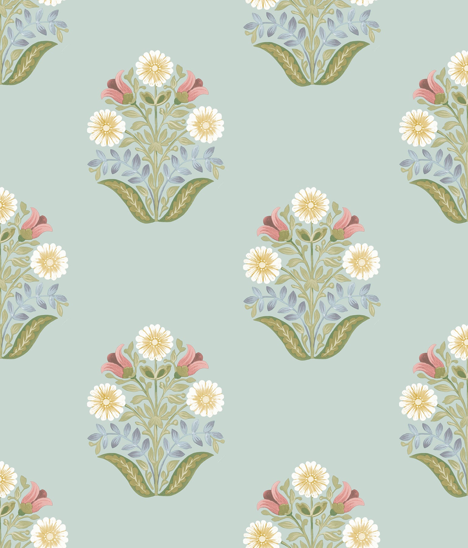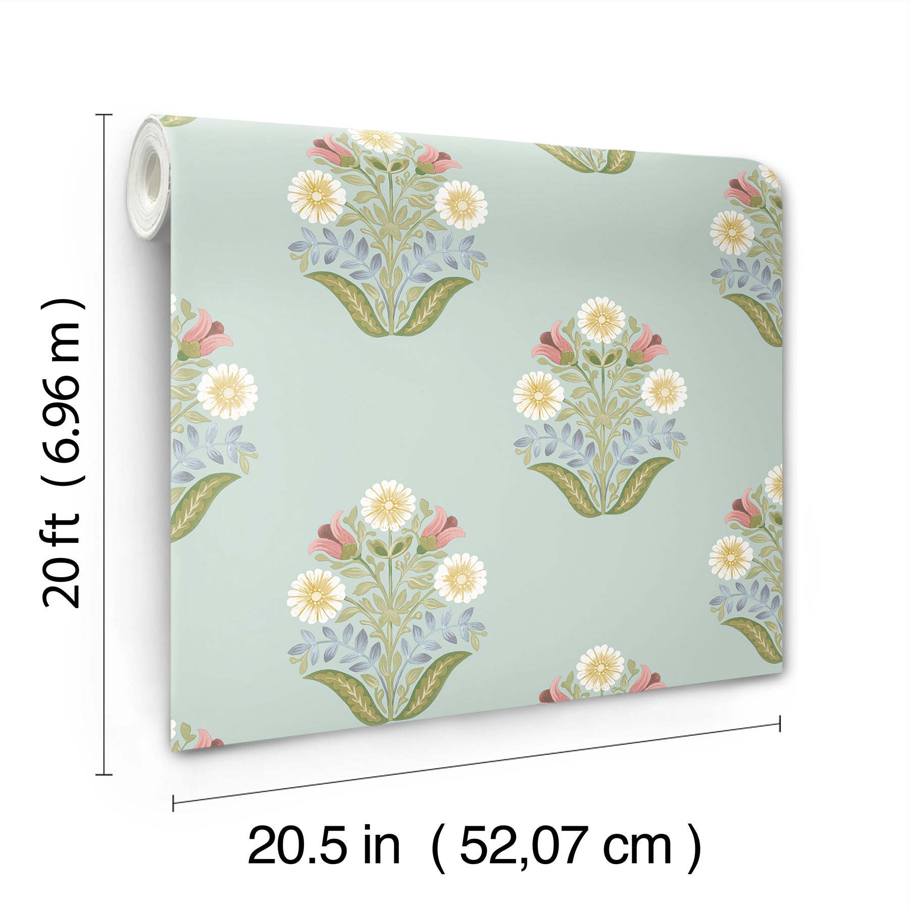 Use:Floral medallion block prints inked in green, blue, white, pink, and yellow, hues against pale robin's egg blue bring verdant, springtime charm to your walls. This Sophie Premium Peel + Stick Wallpaper measures approximately 20.5 inches wide by 20 feet long, measuring approximately 34.2 square feet per roll. Mirth Studio's delightful, hand-painted stylings make their debut on peel + stick wallpaper with this whimsical collection of botanical and bohemian designs.