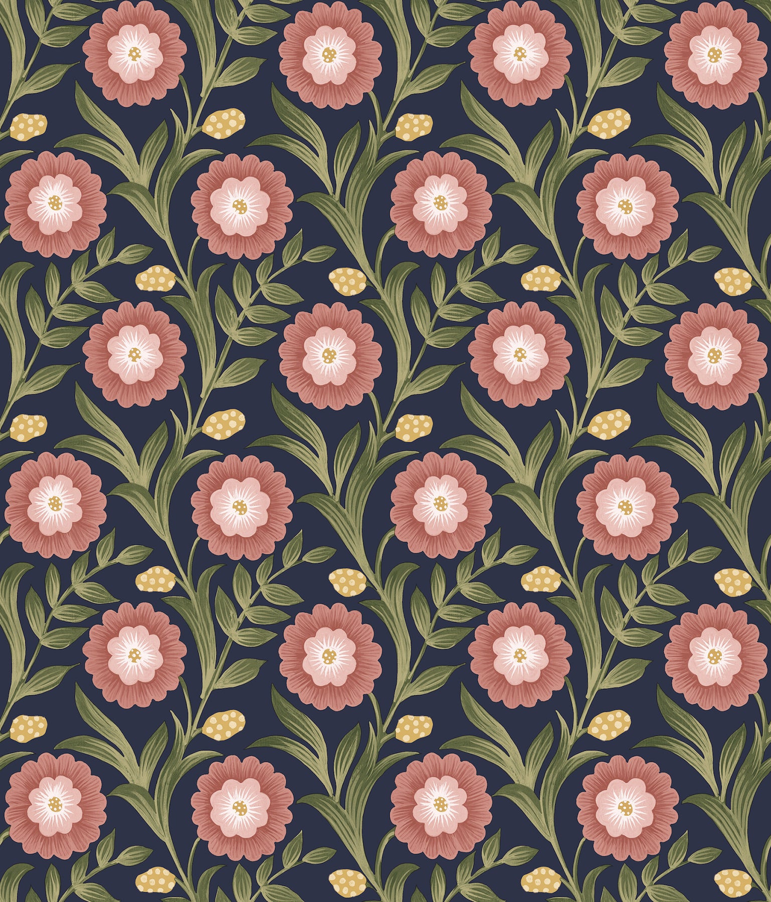 Use:This organic yet uniform floral features winding, leafy green vines dotted with cheerful, circular pink blooms illustrated against a deep blue background. This Lillian Premium Peel + Stick Wallpaper measures approximately 20.5 inches wide by 20 feet long, measuring approximately 34.2 square feet per roll. Mirth Studio's delightful, hand-painted stylings make their debut on peel + stick wallpaper with this whimsical collection of botanical and bohemian designs.