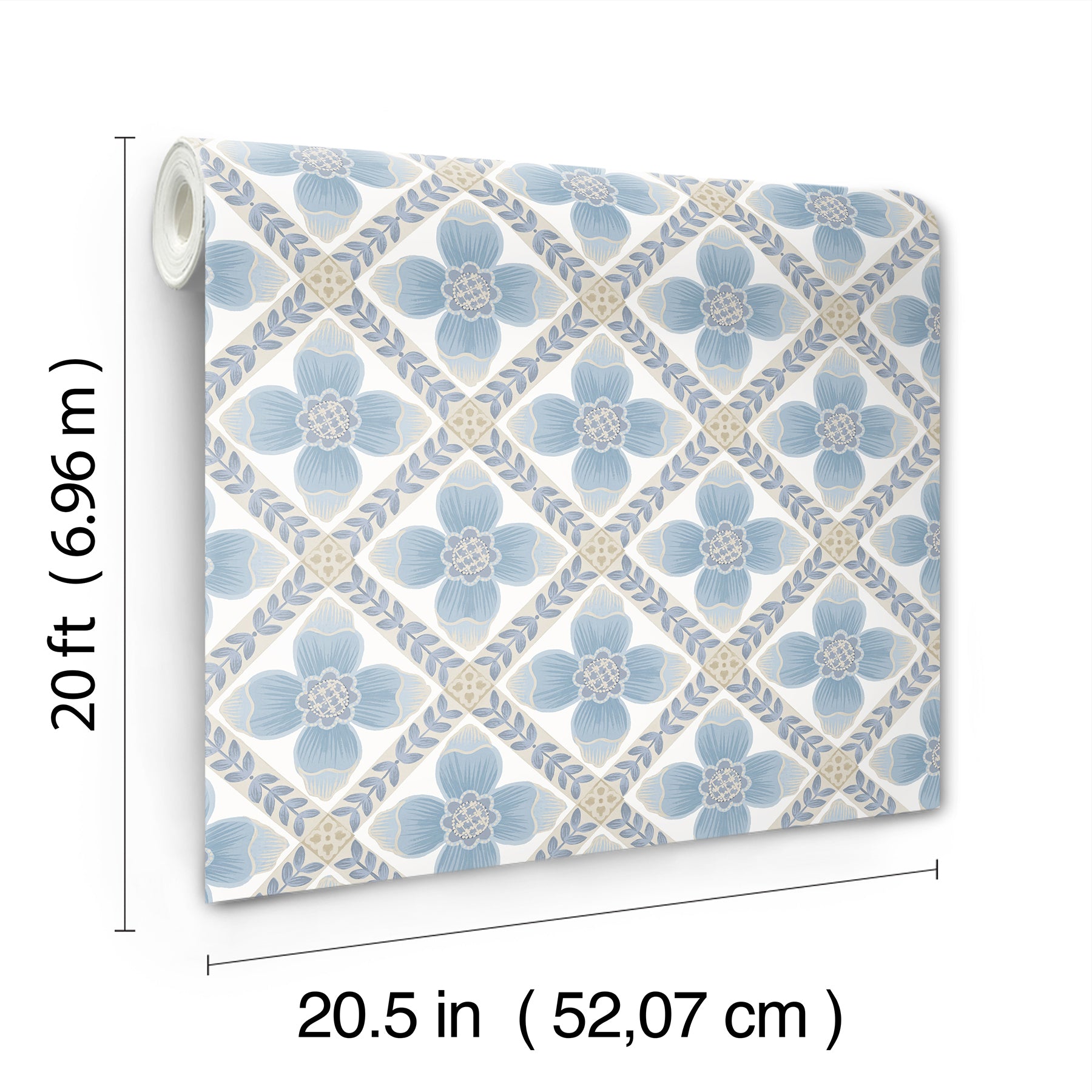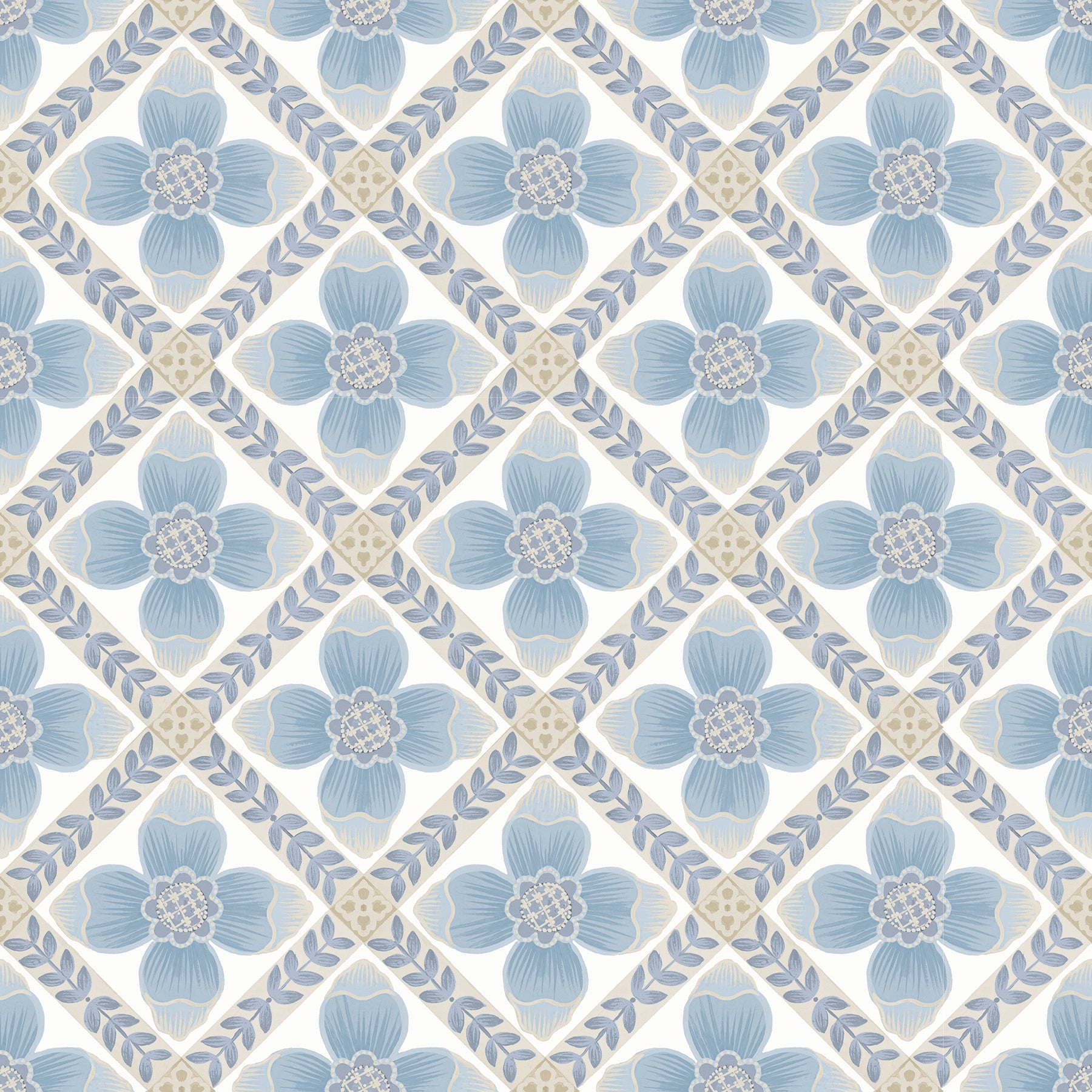 Use:Quilted and charming, this design features blue four-petaled flowers framed by leafy blue vines with cream and taupe floral crests stamped at each corner. This Mimi Premium Peel + Stick Wallpaper measures approximately 20.5 inches wide by 20 feet long, measuring approximately 34.2 square feet per roll. Mirth Studio's delightful, hand-painted stylings make their debut on peel + stick wallpaper with this whimsical collection of botanical and bohemian designs.